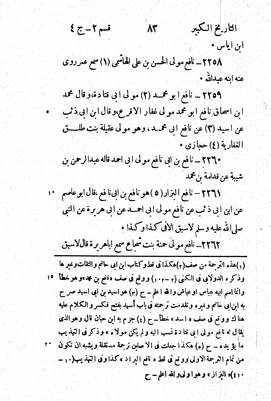 2 - 102) ووقع في صف " نافع بن محمد " وهو خطأ وانما إسم أبيه عباس أو عياش والله أعلم - ح (3) هو اسيد بن أبي اسيد صرح به ابن أبي حاتم وغيره وقد تقدمت ترجمته في باب أسيد بفتح فكسر والكلام عليه هناك ووقع في صف " اسد " خطأ - ح (4) جزم به ابن حبان قال وهو الذي يقال له نافع مولى أبي قتادة نسب إليه ولم يكن مولاه " وذكر في التهذيب ما يؤيده - ح (5) هكذا جعلت في الاصلين ترجمة مستقلة ويشبه أن تكون من تمام الترجمة الاولى ووقع في قط " نافع البراد " كذا وفي التهذيب (