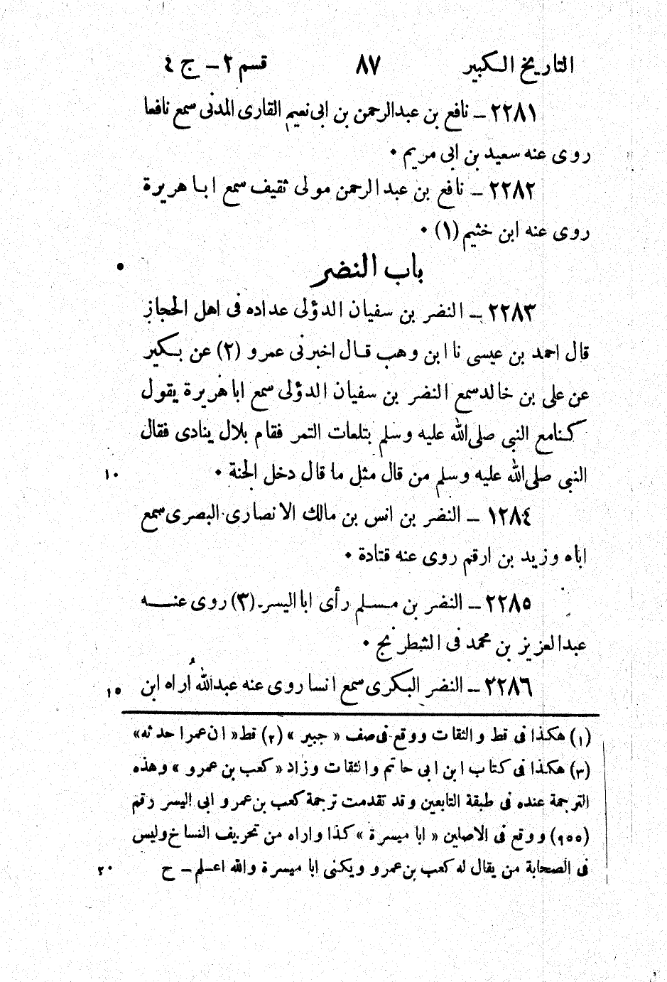 2285 - النضر بْن مُسْلِم رأى أبا اليسر (3) روى عنه عَبْد العزيز بْن مُحَمَّد فِي الشطرنج.