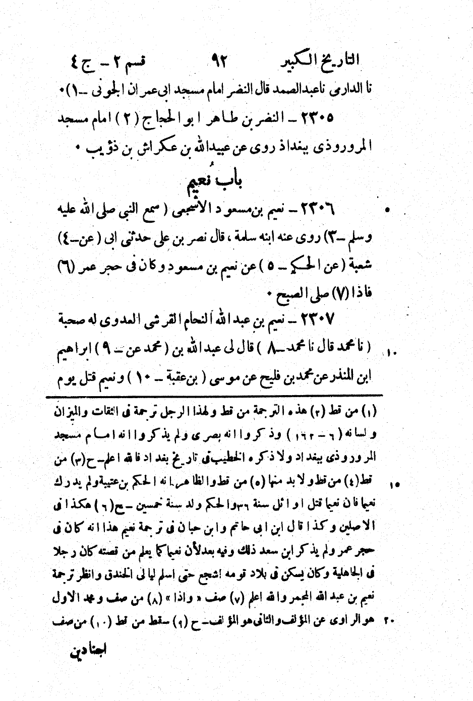 2307 - نعيم بْن عَبْد اللَّه النحام الْقُرَشِيّ العدوي لَهُ صحبة (نا مُحَمَّد قَالَ نا مُحَمَّد - 8) قَالَ لِي عَبْد اللَّه بْن (مُحَمَّد عَنْ - 9) ابراهيم ابن المنذر عَنْ مُحَمَّد بْن فليح عَنْ مُوسَى (بْن عقبة - 10) ونعيم قتل يوم