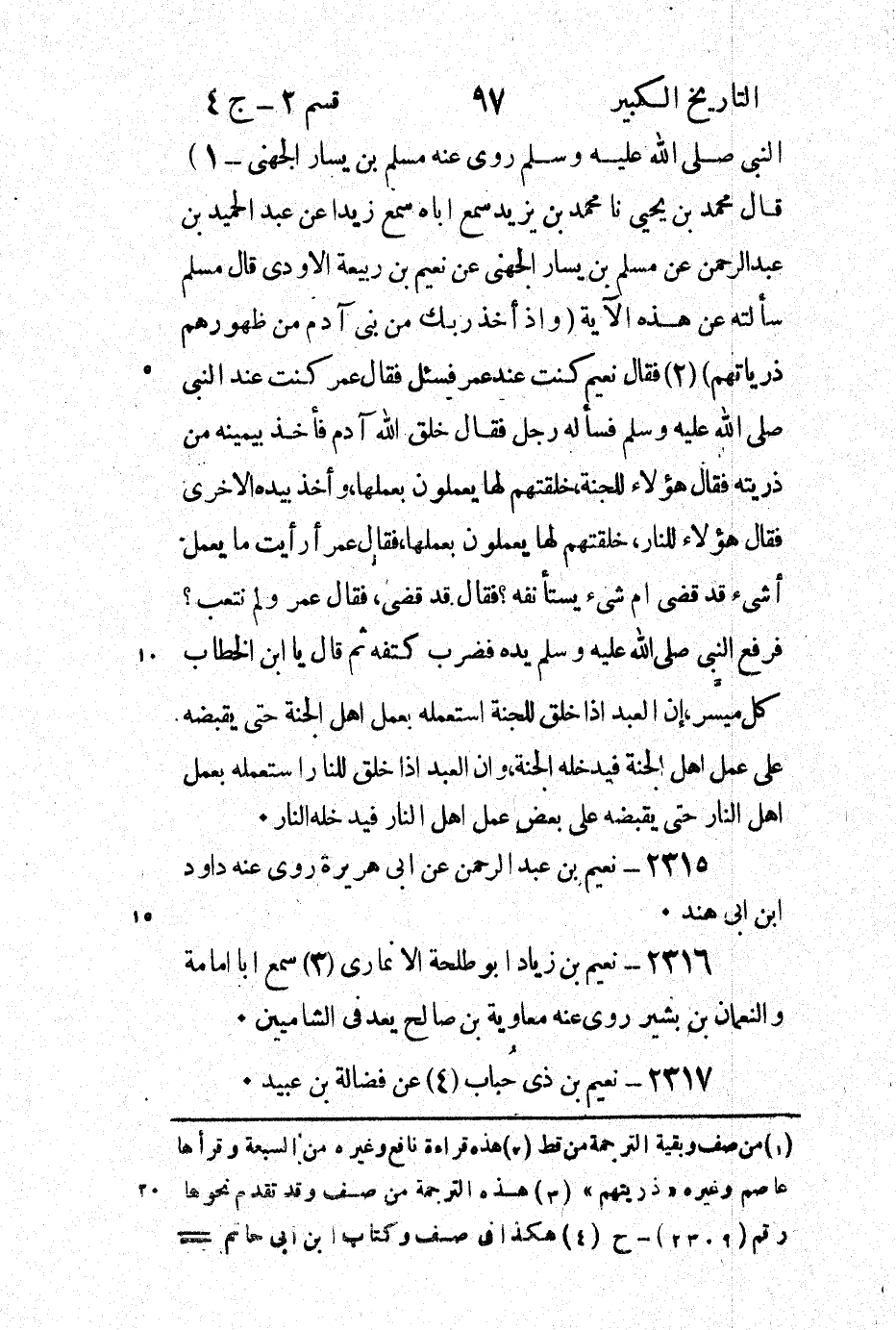 النَّبِيِّ صَلَّى اللَّهُ عَلَيْهِ وَسَلَّمَ روى عَنْهُ مُسْلِمُ بْنُ يَسَارٍ الْجُهَنِيُّ - 1) قَالَ مُحَمَّدُ بْنُ يَحْيَى نا مُحَمَّدُ بْنُ يَزِيدَ سَمِعَ أَبَاهُ سَمِعَ زَيْدًا عَنْ عَبْد الْحَمِيدِ بْن عَبْد الرَّحْمَن عَنْ مُسْلِمِ بْنِ يَسَارٍ الْجُهَنِيِّ عَنْ نعيم بن ربيعة الاودى قال مسلم سألته عن هذه الآية (وإذا أَخَذَ رَبُّكَ مِنْ بَنِي آدَمَ مِنْ ظُهُورِهِمْ ذرياتهم) (2) فَقَالَ نُعَيْمٌ كُنْتُ عِنْدَ عُمَرَ فَسُئِلَ فَقَالَ عُمَرُ كُنْتُ عِنْدَ النَّبِيِّ صَلَّى اللَّهُ عَلَيْهِ وَسَلَّمَ فَسَأَلَهُ رَجُلٌ فَقَالَ خَلَقَ اللَّهُ آدَمَ فَأَخَذَ بِيَمِينِهِ مِنْ ذُرِّيَّتِهِ فَقَالَ هَؤُلاءِ لِلْجَنَّةِ، خلقتهم لما يَعْمَلُونَ بِعَمَلِهَا، وَأَخَذَ بِيَدِهِ الأُخْرَى فَقَالَ هَؤُلاءِ لِلنَّارِ، خَلَقْتُهُمْ لَهَا يَعْمَلُونَ بِعَمَلِهَا، فَقَالَ عُمَرُ أرأيت ما يعمل أشئ قد قضى أم شئ يَسْتَأْنِفُهُ؟ فَقَالَ قَدْ قُضِيَ، فَقَالَ عُمَرُ وَلِمَ نَتْعَبُ؟ فَرَفَعَ النَّبِيُّ صَلَّى اللَّهُ عَلَيْهِ وَسَلَّمَ يده فضرب كتفه ثم قال يا ابن الْخَطَّابِ كُلٌّ مُيَسَّرٌ، إِنَّ الْعَبْدَ إِذَا خُلِقَ لِلْجَنَّةِ اسْتَعْمَلَهُ بِعَمَلِ أَهْلِ الْجَنَّةِ حَتَّى يَقْبِضَهُ عَلَى عَمَلِ أَهْلِ الْجَنَّةِ فَيُدْخِلَهُ الْجَنَّةَ، وَإِنَّ الْعَبْدَ إِذَا خُلِقَ لِلنَّارِ اسْتَعْمَلَهُ بِعَمَلِ أَهْلِ النَّارِ حَتَّى يَقْبِضَهُ عَلَى بَعْضِ عَمَلِ أَهْلِ النَّارِ فَيُدْخِلَهُ النَّارَ.