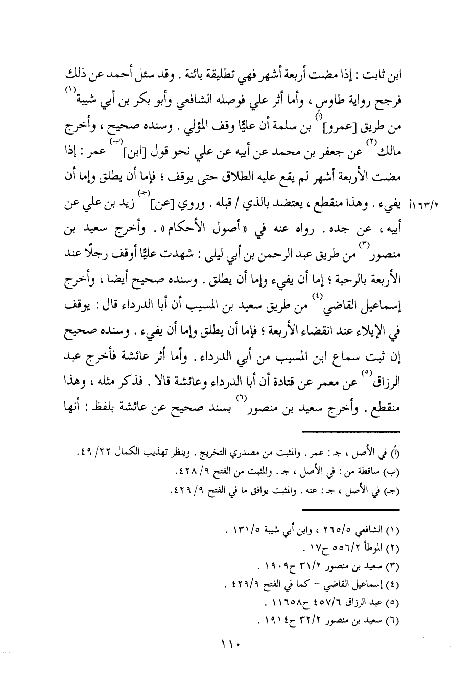 ابن ثابت: إذا مضت أربعة أشهر فهي تطليقة بائنة. وقد سئل أحمد عن ذلك فرجح رواية طاوس، وأما أثر علي فوصله الشافعي وأبو بكر بن أبي شيبة (¬1) من طريق [عمرو] (أ) بن سلمة أن عليًّا وقف المؤلي. وسنده صحيح، وأخرج مالك (¬2) عن جعفر بن محمد عن أبيه عن علي نحو قول [ابن] (ب) عمر: إذا مضت الأربعة أشهر لم يقع عليه الطلاق حتى يوقف؛ فإما أن يطلق وإما أن يفيء. وهذا منقطع، يعتضد بالذي قبله. وروي [عن] (جـ) زيد بن علي عن أبيه، عن جده. رواه عنه في "أصول الأحكام". وأخرج سعيد بن منصور (¬3) من طريق عبد الرحمن بن أبي ليلى: شهدت عليًّا أوقف رجلًا عند الأربعة بالرحبة؛ إما أن يفيء وإما أن يطلق. وسنده صحيح أيضًا، وأخرج إسماعيل القاضي (¬4) من طريق سعيد بن المسيب أن أبا الدرداء قال: يوقف في الإيلاء عند انقضاء الأربعة؛ فإما أن يطلق وإما أن يفيء. وسنده صحيح إن ثبت سماع ابن المسيب من أبي الدرداء. وأما أثر عائشة فأخرج عبد الرزاق (¬5) عن معمر عن قتادة أن أبا الدرداء وعائشة قالا. فذكر مثله، وهذا منقطع. وأخرج سعيد بن منصور (¬6) بسند صحيح عن عائشة بلفظ: أنها