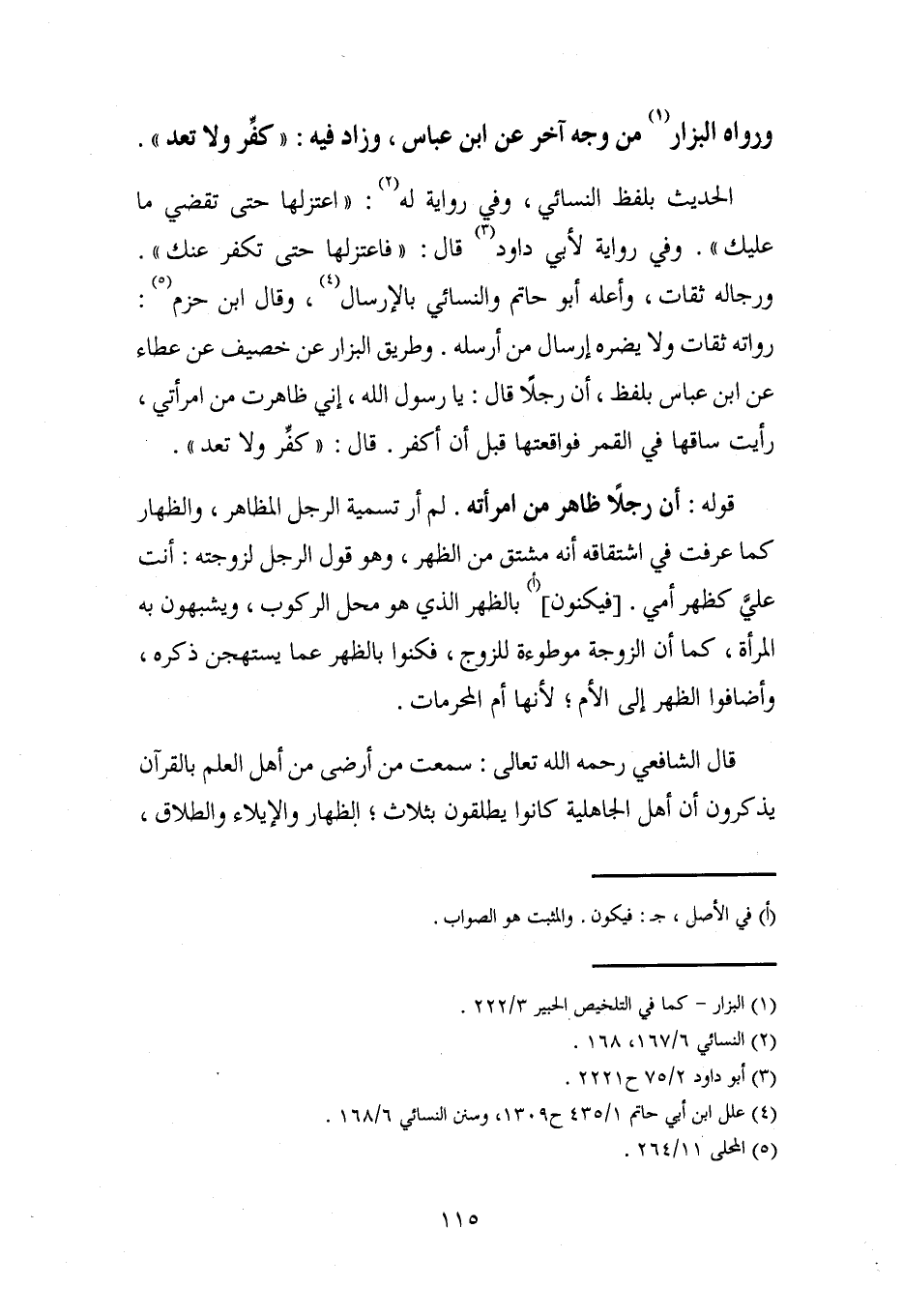 الحديث بلفظ النسائي، وفي رواية له (¬2): "اعتزلها حتى تقضي ما عليك". وفي رواية لأبي داود (¬3) قال: "فاعتزلها حتى تكفر عنك". ورجاله ثقات، وأعله أبو حاتم والنسائي بالإرسال (¬4)، وقال ابن حزم (¬5): رواته ثقات ولا يضره إرسال من أرسله. وطريق البزار عن خصيف عن عطاء عن ابن عباس بلفظ، أن رجلًا قال: يا رسول الله، إني ظاهرت من امرأتي، رأيت ساقها في القمر فواقعتها قبل أن أكفر. قال: "كفِّر ولا تعد".