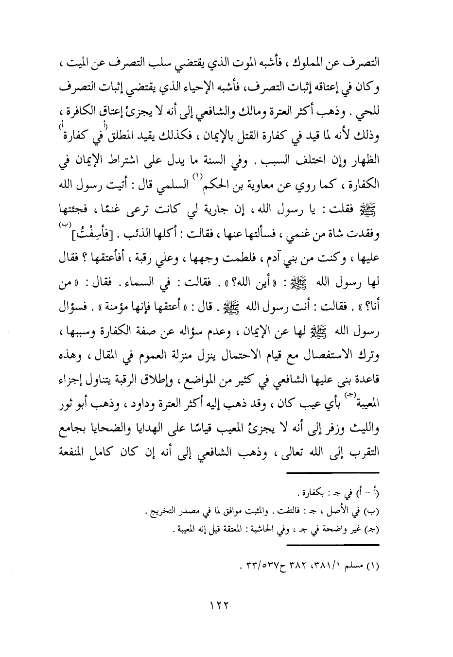 التصرف عن المملوك، فأشبه الموت الذي يقتضي سلب التصرف عن الميت، وكان في إعتاقه إثبات التصرف، فأشبه الإحياء الذي يقتضي إثبات التصرف للحي. وذهب أكثر العترة ومالك والشافعي إلى أنه لا يجزئ إعتاق الكافرة، وذلك لأنه لما قيد في كفارة القتل بالإيمان، فكذلك يقيد المطلق (أفي كفارة أ) الظهار وإن اختلف السبب. وفي السنة ما يدل على اشتراط الإيمان في الكفارة، كما روي عن معاوية بن الحكم (¬1) السلمي قال: أتيت رسول الله - صلى الله عليه وسلم - فقلت: يا رسول الله، إن جارية لي كانت ترعى غنمًا، فجئتها وفقدت شاة من غنمي، فسألتها عنها، فقالت: أكلها الذئب. [فأسِفْتُ] (ب) عليها، وكنت من بني آدم، فلطمت وجهها، وعلي رقبة، أفأعتقها؟ فقال لها رسول الله - صلى الله عليه وسلم -: "أين الله؟ ". فقالت: في السماء. فقال: "من أنا؟ ". فقالت: أنت رسول الله - صلى الله عليه وسلم -. قال: "أعتقها فإنها مؤمنة". فسؤال رسول الله - صلى الله عليه وسلم - لها عن الإيمان، وعدم سؤاله عن صفة الكفارة وسببها، وترك الاستفصال مع قيام الاحتمال ينزل منزلة العموم في المقال، وهذه قاعدة بنى عليها الشافعي في كثير من المواضع، وإطلاق الرقبة يتناول إجزاء المعيبة (جـ) بأي عيب كان، وقد ذهب إليه أكثر العترة وداود، وذهب أبو ثور والليث وزفر إلى أنه لا يجزئ المعيب قياسًا على الهدايا والضحايا بجامع التقريب إلى الله تعالى، وذهب الشافعي إلى أنه إن كان كامل المنفعة