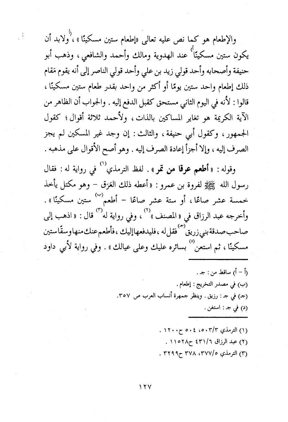 والإطعام هو كما نص عليه تعالى "إطعام ستين مسكينًا"، (أولا بد أن يكون ستين مسكينًا أ) عند الهدوية ومالك وأحمد والشافعي، وذهب أبو حنيفة وأصحابه وأحد قولي زيد بن علي وأحد قولي الناصر إلى أنه يقوم مَقام ذلك إطعام واحد ستين يومًا أو أكثر من واحد بقدر طعام ستين مسكينًا، قالوا: لأنه في اليوم الثاني مستحق كقبل الدفع إليه. والجواب أن الظاهر من الآية الكريمة هو تغاير المساكين بالذات، ولأحمد ثلاثة أقوال؛ كقول الجمهور، وكقول أبي حنيفة، والثالث: إن وجد غير المسكين لم يجز الصرف إليه، وإلا أجزأ إعادة الصرف إليه. وهو أصح الأقوال على مذهبه.