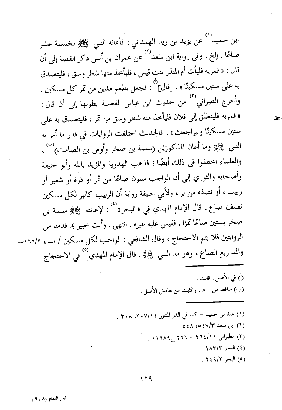 ابن حميد (¬1) عن يزيد بن زيد الهمداني: فأعانه النبي - صلى الله عليه وسلم - بخمسة عشر صاعًا. إلخ. وفي رواية ابن سعد (¬2) عن عمران بن أنس ذكر القصة إلى أن قال: "فمريه فليأت أم المنذر بنت قيس، فليأخذ منها شطر وسق، فليتصدق به على ستين مسكينًا". [قال] (أ): فجعل يطعم مدين من تمر كل مسكين. وأخرج الطبراني (¬3) من حديث ابن عباس القصة بطولها إلى أن قال: "فمريه فلينطلق إلى فلان فليأخذ منه شطر وسق من تمر، فليتصدق به على ستين مسكينًا وليراجعك". فالحديث اختلفت الروايات في قدر ما أمر به النبي - صلى الله عليه وسلم - وما أعان المذكورَيْن (سلمة بن صخر وأوس بن الصامت) (ب)، والعلماء اختلفوا في ذلك أيضًا؛ فذهب الهدوية والمؤيد بالله وأبو حنيفة وأصحابه والثوري إلى أن الواجب ستون صاعًا من تمر أو ذرة أو شعير أو زبيب، أو نصفه من بر، ولأبي حنيفة رواية أن الزبيب كالبر لكل مسكين نصف صاع. قال الإمام المهدي في "البحر" (¬4): لإعانته - صلى الله عليه وسلم - سلمة بن صخر بستين صاعًا تمرًا، فقيس عليه غيره. انتهى. وأنت خبير بما قدمنا من الروايتين فلا يتم الاحتجاج، وقال الشافعي: الواجب لكل مسكين مد، والمد ربع الصاع، وهو مد النبي - صلى الله عليه وسلم -. قال الإمام المهدي (¬5) في الاحتجاج