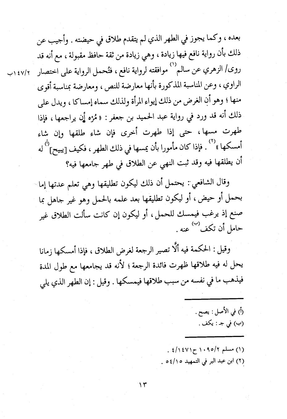بعده، وكما يجوز في الطهر الذي لم يتقدم طلاق في حيضته. وأجيب عن ذلك بأن رواية نافع فيها زيادة، وهي زيادة من ثقة حافظ مقبولة، مع أنه قد روى الزهريّ عن سالم (¬1) موافقته لرواية نافع، فتُحمل الرواية على اختصار الراوي، وعن المناسبة المذكورة بأنها معارضة للنص، ومعارضة بمناسبة أقوى منها، وهو أن الغرض من ذلك إيواء المرأة ولذلك سماه إمساكا، ويدل على ذلك أنه قد ورد في رواية عبد الحميد بن جعفر: "مُره أن يراجعها، فإذا طهرت مسها، حتى إذا طهرت أخرى فإن شاء طلقها وإن شاء أمسكها" (¬2). فإذا كان مأمورا بأن يمسها في ذلك الطهر، فكيف [يبيح] (أ) له أن يطلقها فيه وقد ثبت النهي عن الطلاق في طهر جامعها فيه؟