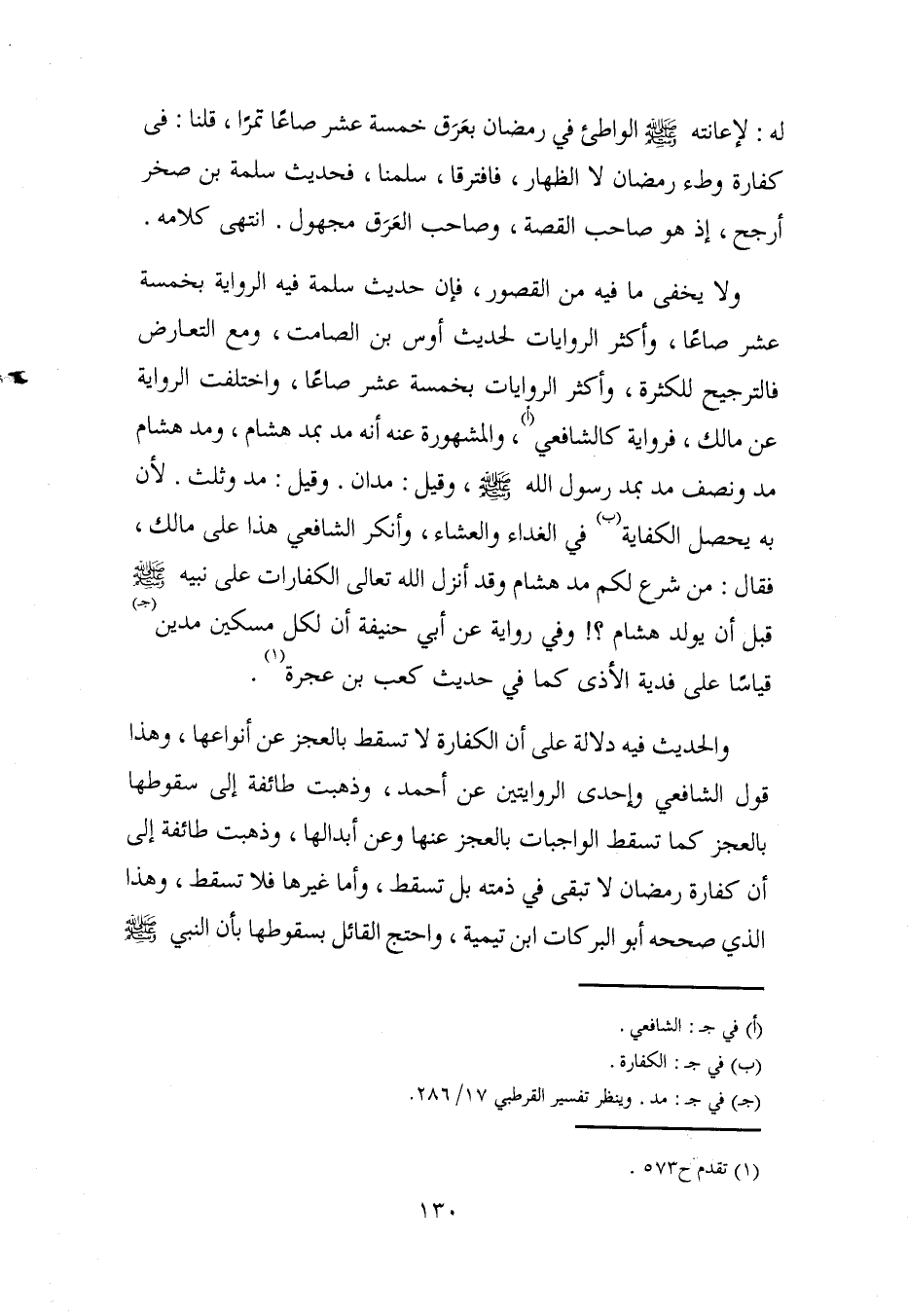 ولا يخفى ما فيه من القصور، فإن حديث سلمة فيه الرواية بخمسة عشر صاعًا، وأكثر الروايات لحديث أوس بن الصامت، ومع التعارض فالترجيح للكثرة، وأكثر الروايات بخمسة عشر صاعًا، واختلفت الرواية عن مالك، فرواية كالشافعي (أ)، والمشهورة عنه أنه مد بمد هشام، ومد هشام مد ونصف مد بمد رسول الله - صلى الله عليه وسلم -، وقيل: مدان. وقيل: مد وثلث. لأن به يحصل الكفاية (ب) في الغداء والعشماء، وأنكر الشافعي هذا على مالك، فقال: من شرع لكم مد هشام وقد أنزل الله تعالى الكفارات على نبيه - صلى الله عليه وسلم - قبل أن يولد هشام؟! وفي رواية عن أبي حنيفة أن لكل مسكين مدين (جـ) قياسًا على فدية الأذى كما في حديث كعب بن عجرة (¬1).