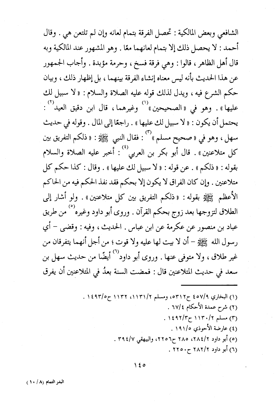 الشافعي وبعض المالكية: تحصل الفرقة بتمام لعانه وإن لم تلتعن هي. وقال أحمد: لا يحصل ذلك إلا بتمام لعانهما معًا. وهو المشهور عند المالكية وبه قال أهل الظاهر، قالوا: وهي فرقة فسخ، وحرمة مؤبدة. وأجاب الجمهور عن هذا الحديث بأنه ليس معناه إنشاء الفرقة بينهما، بل إظهار ذلك، وبيان حكم الشرع فيه، ويدل لذلك قوله عليه الصلاة والسلام: "لا سبيل لك عليها". وهو في "الصحيحين" (¬1) وغيرهما، قال ابن دقيق العيد (¬2): يحتمل أن يكون: "لا سبيل لك عليها". راجعًا إلى المال. وقوله في حديث سهل، وهو في "صحيح مسلم" (¬3): فقال النبي - صلى الله عليه وسلم -: "ذلكم التفريق بين كل متلاعنين". قال أبو بكر بن العربي (¬4): أخبر عليه الصلاة والسلام بقوله: "ذلكم". عن قوله: "لا سبيل لك عليها". وقال: كذا حكم كل متلاعنين. وإن كان الفراق لا يكون إلا بحكم فقد نفذ الحكم فيه من الحاكم الأعظم - صلى الله عليه وسلم - بقوله: "ذلكم التفريق بين كل متلاعنين". ولو أشار إلى الطلاق لتزوجها بعد زوج بحكم القرآن. وروى أبو داود وغيره (¬5) من طريق عباد بن منصور عن عكرمة عن ابن عباس. الحديث، وفيه: وقضى -أي رسول الله - صلى الله عليه وسلم - أن لا بيت لها عليه ولا قوت؛ من أجل أنهما يتفرقان من غير طلاق، ولا متوفى عنها. وروى أبو داود (¬6) أيضًا من حديث سهل بن سعد في حديث المتلاعنين قال: فمضت السنة بعدُ في المتلاعنين أن يفرق