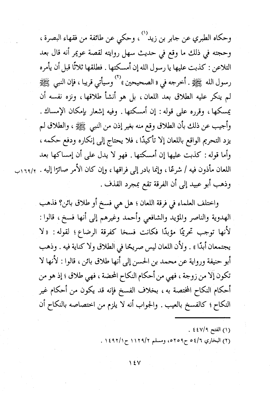 وحكاه الطبري عن جابر بن زيد (¬1)، وحكي عن طائفة من فقهاء البصرة، وحجته في ذلك ما وقع في حديث سهل روايته لقصة عويمر أنه قال بعد التلاعن: كذبت عليها يا رسول الله إن أمسكتها. فطلقها ثلاثًا قبل أن يأمره رسول الله - صلى الله عليه وسلم -. أخرجه في "الصحيحين" (¬2) وسيأتي قريبا، فإن النبي - صلى الله عليه وسلم - لم ينكر عليه الطلاق بعد اللعان، بل هو أنشأ طلاقها، ونزه نفسه أن يمسكها، وقرره على قوله: إن أمسكتها. وفيه إشعار بإمكان الإمساك. وأجيب عن ذلك بأن الطلاق وقع منه بغير إذن من النبي - صلى الله عليه وسلم -، والطلاق لم يزد التحريم الواقع باللعان إلا تأكيدًا، فلا يحتاج إلى إنكاره ودفع حكمه، وأما قوله: كذبت عليها إن أمسكتها. فهو لا يدل على أن إمساكها بعد اللعان مأذون فيه شرعًا، وإنما بادر إلى فراقها، وإن كان الأمر صائرًا إليه وذهب أبو عبيد إلى أن الفرقة تقع بمجرد القذف.