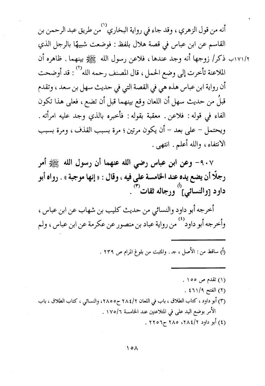 907 - وعن ابن عباس رضي الله عنهما أن رسول الله - صلى الله عليه وسلم - أمر رجلًا أن يضع يده عند الخامسة على فيه، وقال: "إنها موجبة". رواه أبو داود [والنسائي] (أ) ورجاله ثقات (¬3).
