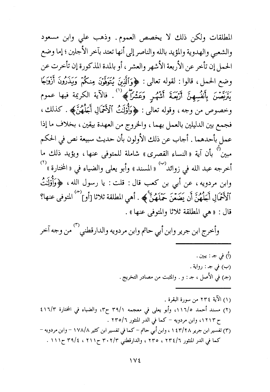 المطلقات ولكن ذلك لا يخصص العموم. وذهب علي وابن مسعود والشعبي والهدوية والمؤيد بالله والناصر إلى أنها تعتد بآخر الأجلين؛ إما وضع الحمل إن تأخر عن الأربعة الأشهر والعشر، أو بالمدة المذكورة إن تأخرت عن وضع الحمل، قالوا: لقوله تعالى: {وَالَّذِينَ يُتَوَفَّوْنَ مِنْكُمْ وَيَذَرُونَ أَزْوَاجًا يَتَرَبَّصْنَ بِأَنْفُسِهِنَّ أَرْبَعَةَ أَشْهُرٍ وَعَشْرًا} (¬1). فالآية الكريمة فيها عموم وخصوص من وجه، وقوله تعالى: {وَأُولَاتُ الْأَحْمَالِ أَجَلُهُنَّ}. كذلك، فجمع بين الدليلين بالعمل بهما، والخروج من العهدة بيقين، بخلاف ما إذا عمل بأحدهما. أجاب عن ذلك الأولون بأن حديث سبيعة نص في الحكم مبين (أ) بأن آية "النساء القصرى" شاملة للمتوفى عنها، ويؤيد ذلك ما أخرجه عبد الله في زوائد (ب) "السند" وأبو يعلى والضياء في "المختارة" (¬2) وابن مردويه، عن أبي بن كعب قال: قلت: يا رسول الله، {وَأُولَاتُ الْأَحْمَالِ أَجَلُهُنَّ أَنْ يَضَعْنَ حَمْلَهُنَّ}. أهي المطلقة ثلاثا [أو] (جـ) المتوفى عنها؟ قال: "هي المطلقة ثلاثا والمتوفى عنها".