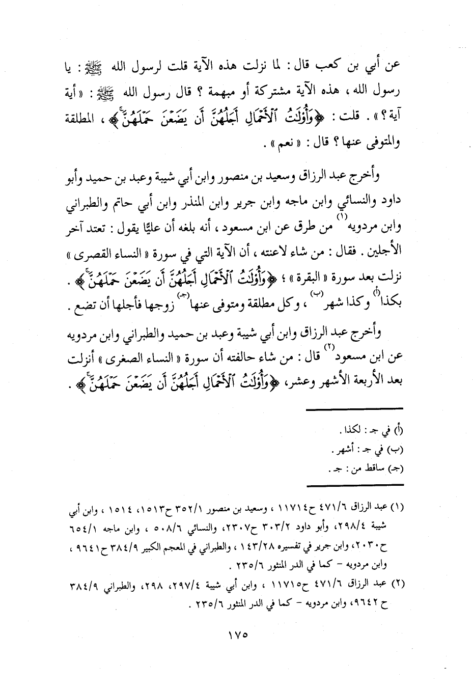 وأخرج عبد الرزاق وسعيد بن منصور وابن أبي شيبة وعبد بن حميد وأبو داود والنسائي وابن ماجه وابن جرير وابن المنذر وابن أبي حاتم والطبراني وابن مردويه (¬1) من طرق عن ابن مسعود، أنه بلغه أن عليًّا يقول: تعتد آخر الأجلين. فقال: من شاء لاعنته، أن الآية التي في سورة "النساء القصرى" نزلت بعد سورة "البقرة"؛ {وَأُولَاتُ الْأَحْمَالِ أَجَلُهُنَّ أَنْ يَضَعْنَ حَمْلَهُنَّ}. بكذا (أ) وكذا شهر (ب)، وكل مطلقة ومتوفى عنها (جـ) زوجها فأجلها أن تضع.