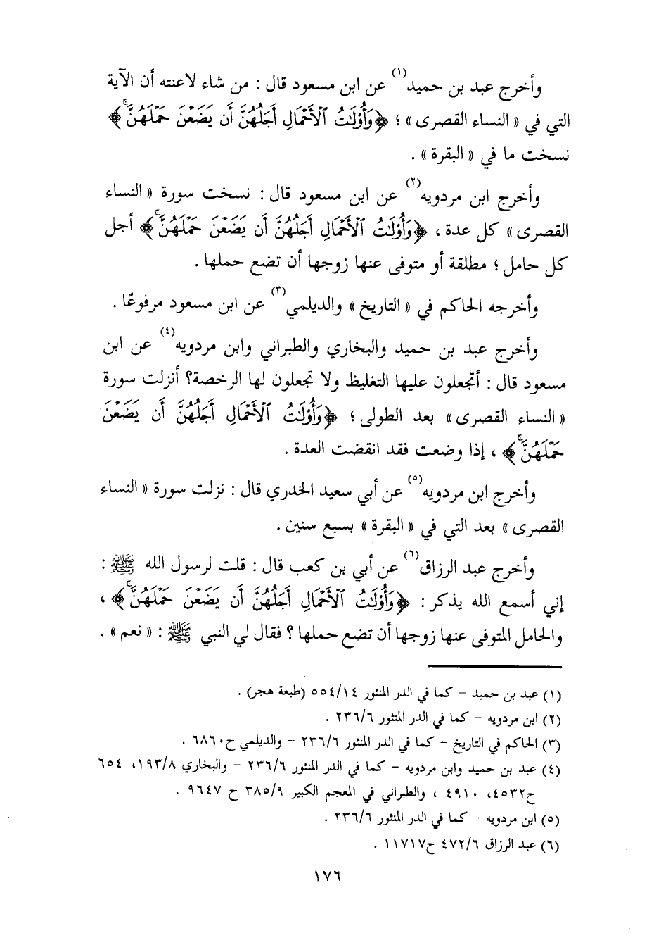 وأخرج عبد بن حميد والبخاري والطبراني وابن مردويه (¬4) عن ابن مسعود قال: أتجعلون عليها التغليظ ولا تجعلون لها الرخصة؟ أنزلت سورة "النساء القصرى" بعد الطولى؛ {وَأُولَاتُ الْأَحْمَالِ أَجَلُهُنَّ أَنْ يَضَعْنَ حَمْلَهُنَّ}، إذا وضعت فقد انقضت العدة.