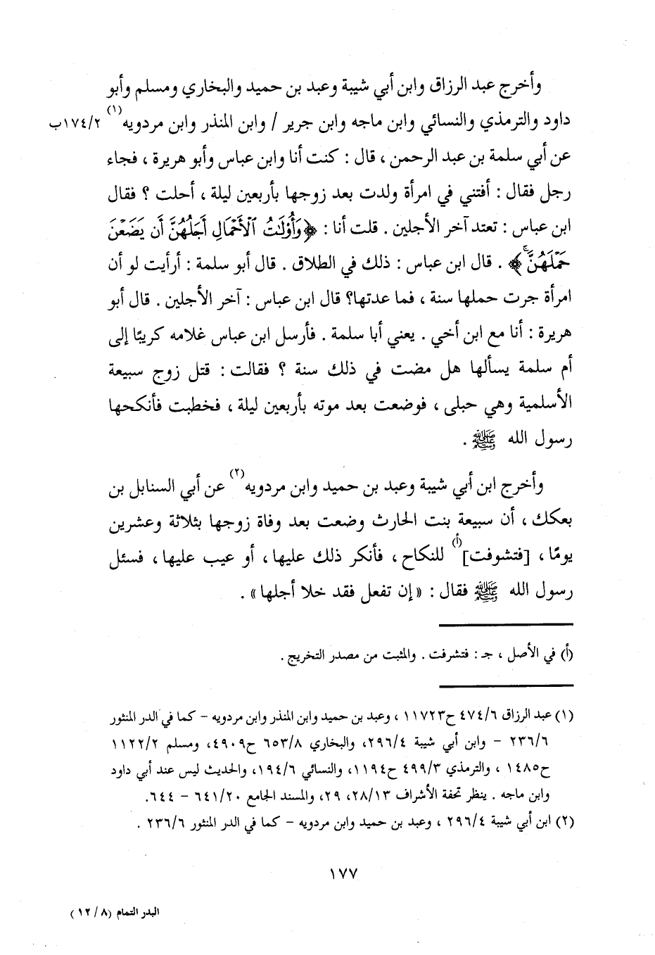 وأخرج عبد الرزاق وابن أبي شيبة وعبد بن حميد والبخاري ومسلم وأبو داود والترمذي والنسائي وابن ماجه وابن جرير وابن المنذر وابن مردويه (¬1) عن أبي سلمة بن عبد الرحمن، قال: كنت أنا وابن عباس وأبو هريرة، فجاء رجل فقال: أفتني في امرأة ولدت بعد زوجها بأربعين ليلة، أحلت؟ فقال ابن عباس: تعتد آخر الأجلين. قلت أنا: {وَأُولَاتُ الْأَحْمَالِ أَجَلُهُنَّ أَنْ يَضَعْنَ حَمْلَهُنَّ}. قال ابن عباس: ذلك في الطلاق. قال أبو سلمة: أرأيت لو أن امرأة جرت حملها سنة، فما عدتها؟ قال ابن عباس: آخر الأجلين. قال أبو هريرة: أنا مع ابن أخي. يعني أبا سلمة. فأرسل ابن عباس غلامه كريبًا إلى أم سلمة يسألها هل مضت في ذلك سنة؟ فقالت: قتل زوج سبيعة الأسلمية وهي حبلى، فوضعت بعد موته بأربعين ليلة، فخطبت فأنكحها رسول الله - صلى الله عليه وسلم -.