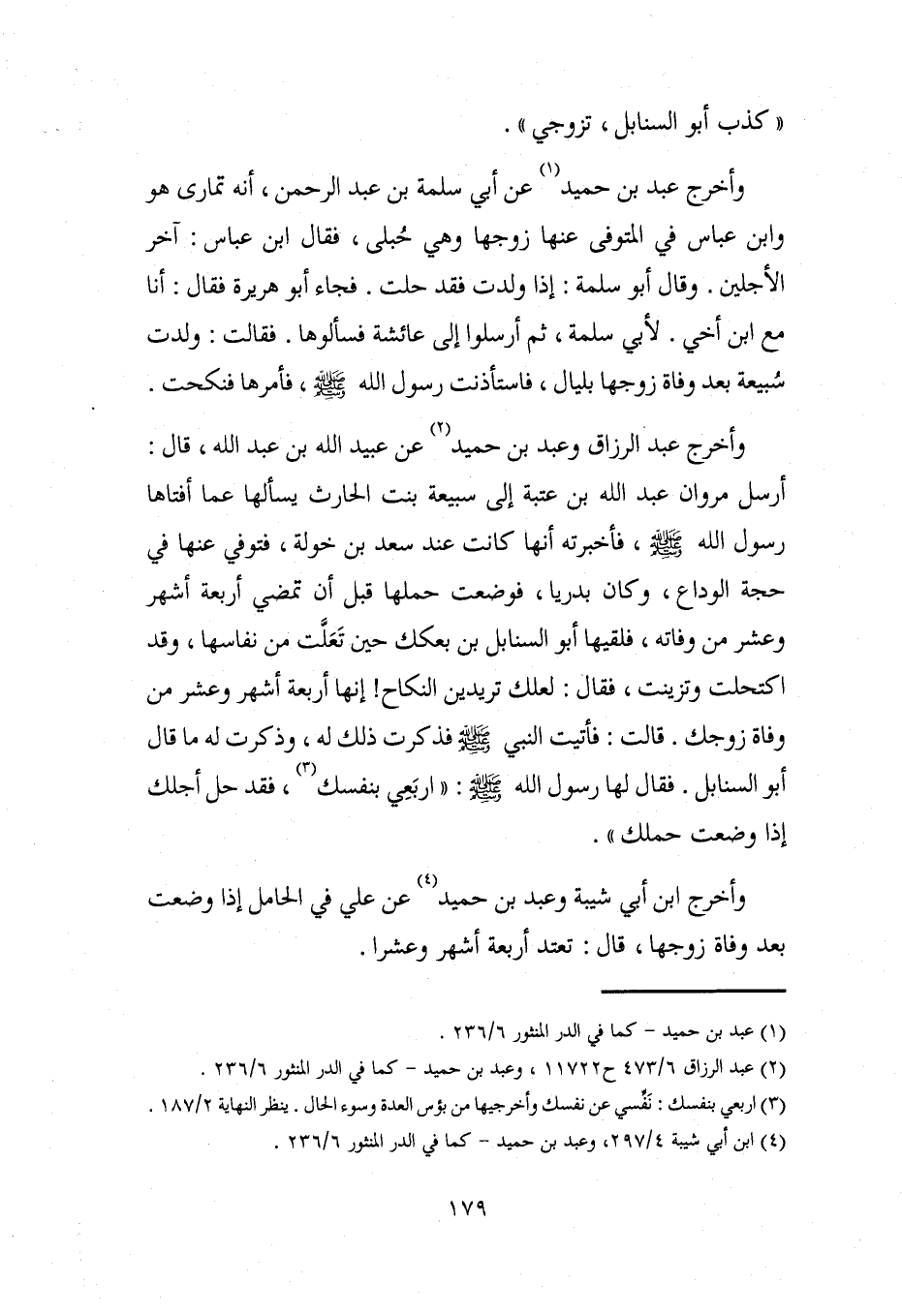 وأخرج عبد الرزاق وعبد بن حميد (¬2) عن عبيد الله بن عبد الله، قال: أرسل مروان عبد الله بن عتبة إلى سبيعة بنت الحارث يسألها عما أفتاها رسول الله - صلى الله عليه وسلم -، فأخبرته أنها كانت عند سعد بن خولة، فتوفي عنها في حجة الوداع، وكان بدريا، فوضعت حملها قبل أن تمضي أربعة أشهر وعشر من وفاته، فلقيها أبو السنابل بن بعكك حين تَعَلَّت من نفاسها، وقد اكتحلت وتزينت، فقال: لعلك تريدين النكاح! إنها أربعة أشهر وعشر من وفاة زوجك. قالت: فأتيت النبي - صلى الله عليه وسلم - فذكرت ذلك له، وذكرت له ما قال أبو السنابل. فقال لها رسول الله - صلى الله عليه وسلم -: "اربَعِي بنفسك (¬3)، فقد حل أجلك إذا وضعت حملك".