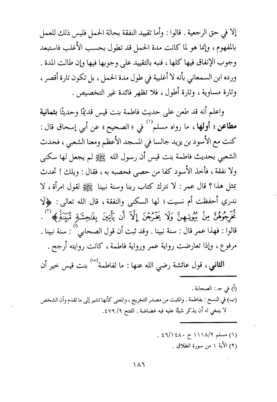 واعلم أنه قد طعن علي حديث فاطمة بنت قيس قديمًا وحديثًا بثمانية مطاعن؛ أولها، ما رواه مسلم (¬1) في "الصحيح" عن أبي إسحاق قال: كنت مع الأسود بن يزيد جالسا في المسجد الأعظم ومعنا الشعبي، فحدث الشعبي بحديث فاطمة بنت قيس أن رسول الله - صلى الله عليه وسلم - يجعل لها سكنى ولا نفقة، فأخذ الأسود كفا من حصى فحصبه به، فقال: ويلك! تحدث بمثل هذا؟ قال عمر: لا نترك كتاب ربنا وسنة نبينا - صلى الله عليه وسلم - لقول امرأة، لا ندري أحفظت أم نسيت، لها السكنى والنفقة، قال الله تعالى: {لَا تُخْرِجُوهُنَّ مِنْ بُيُوتِهِنَّ وَلَا يَخْرُجْنَ إلا أَنْ يَأْتِينَ بِفَاحِشَةٍ مُبَيِّنَةٍ} (¬2). قالوا: فهذا عمر قال: سنة نبينا. وقد ثبت أن قول الصحابي (أ): سنة نبينا. مرفوع، وإذا تعارضت رواية عمر ورواية فاطمة، كانت روايته أرجح.