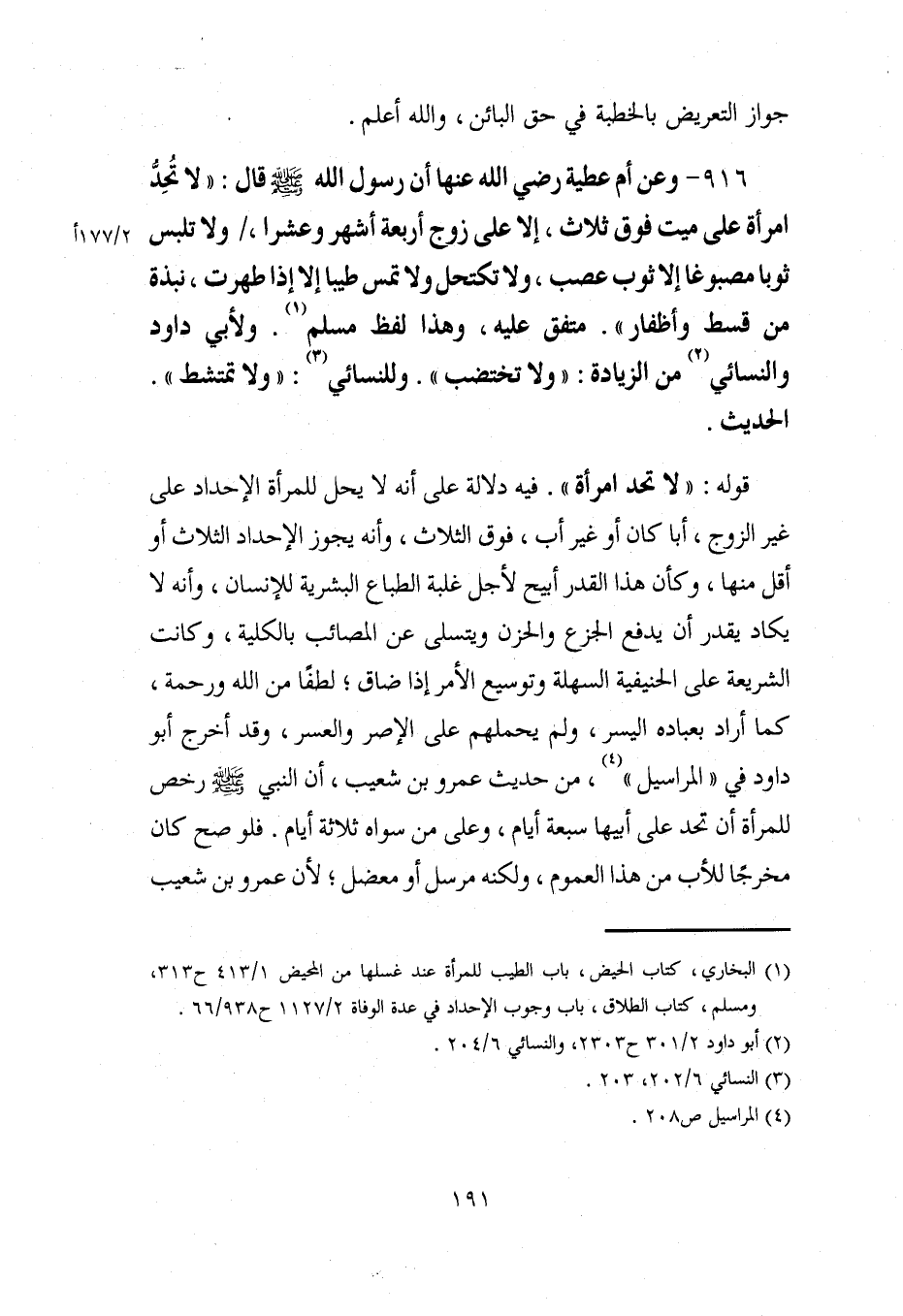 916 - وعن أم عطية رضي الله عنها أن رسول الله - صلى الله عليه وسلم - قال: "لا تُحِدّ امرأة على ميت فوق ثلاث، إلا على زوج أربعة أشهر وعشرا، ولا تلبس ثوبا مصبوغا إلا ثوب عصب، ولا تكتحل ولا تمس طيبا إلا إذا طهرت، نبذة من قسط وأظفار". متفق عليه، وهذا لفظ مسلم (¬1). ولأبي داود والنسائي (¬2) من الزيادة: "ولا تختضب". وللنسائي (¬3): "ولا تمتشط". الحديث.