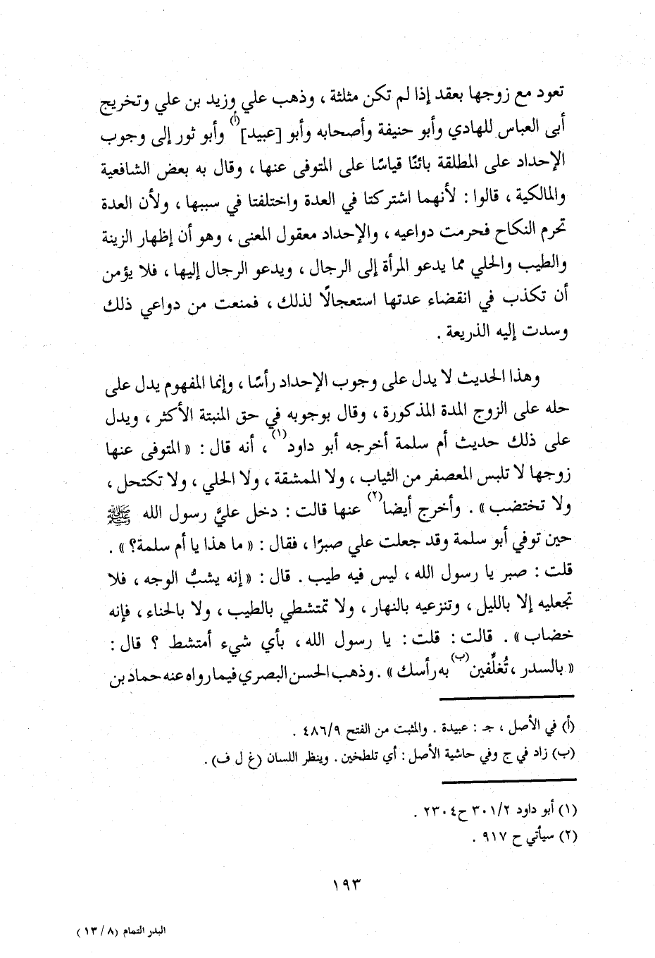 وهذا الحديث لا يدل على وجوب الإحداد رأسًا، وإنما المفهوم يدل على حله على الزوج المدة المذكورة، وقال بوجوبه في حق المنبتة الأكثر، ويدل على ذلك حديث أم سلمة أخرجه أبو داود (¬1)، أنه قال: "المتوفى عنها زوجها لا تلبس المعصفر من الثياب، ولا الممشقة، ولا الحلي، ولا تكتحل، ولا تختضب". وأخرج أيضًا (¬2) عنها قالت: دخل علي رسول الله - صلى الله عليه وسلم - حين توفي أبو سلمة وقد جعلت علي صبرًا، فقال: "ما هذا يا أم سلمة؟ ". قلت: صبر يا رسول الله، ليس فيه طيب. قال: "إنه يشبُّ الوجه، فلا تجعليه إلا بالليل، وتنزعيه بالنهار، ولا تمتشطي بالطيب، ولا بالحناء، فإنه خضاب". قالت: قلت: يا رسول الله، بأي شيء أمتشط؟ قال: "بالسدر، تُغلِّفين (ب) به رأسك". وذهب الحسن البصري فيما رواه عنه حماد بن