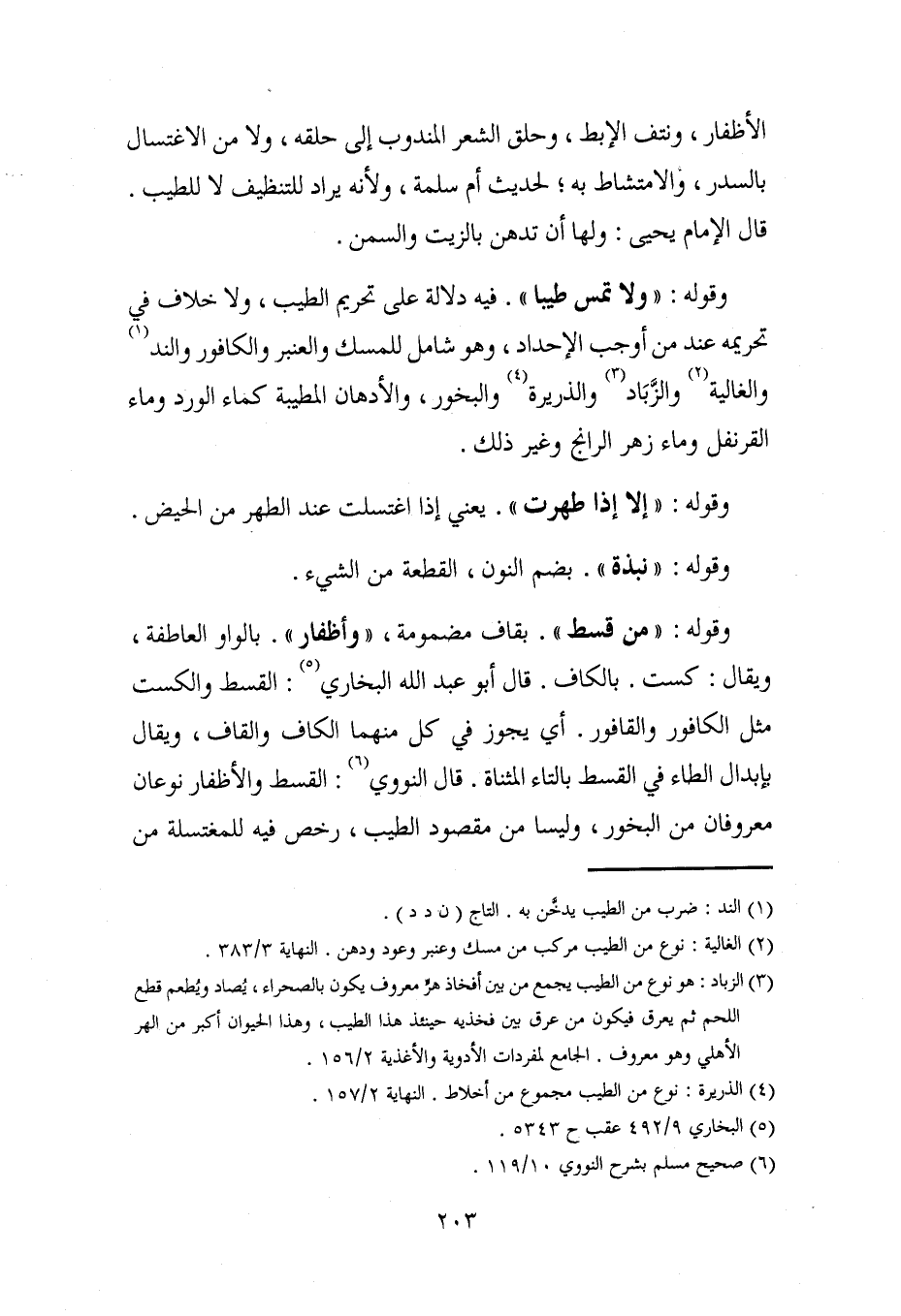 (¬3) الزباد: هو نوع من الطيب يجمع من بين أفخاذ هرٍّ معروف يكون بالصحراء، يُصاد ويُطعم قطع اللحم ثم يعرق فيكون من عرق بين فخذيه حينئذ هذا الطيب، وهذا الحيوان أكبر من الهر الأهلي وهو معروف. الجامع لمفردات الأدوية والأغذية 2/ 156.