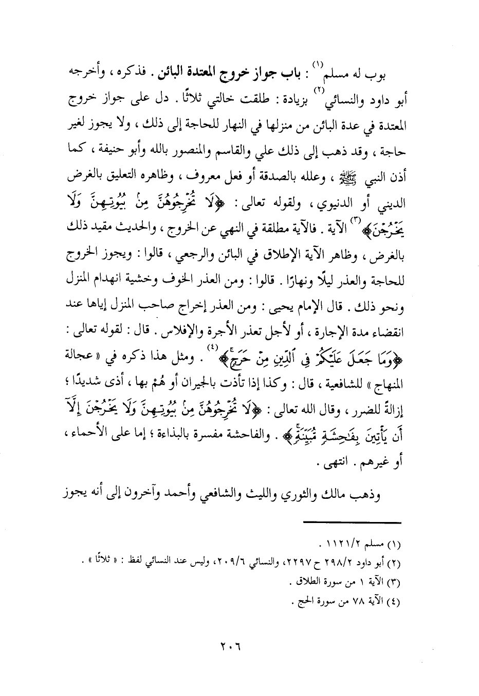 بوب له مسلم (¬1): باب جواز خروج المعتدة البائن. فذكره، وأخرجه أبو داود والنسائي (¬2) بزيادة: طلقت خالتي ثلاثًا. دل على جواز خروج المعتدة في عدة البائن من منزلها في النهار للحاجة إلى ذلك، ولا يجوز لغير حاجة، وقد ذهب إلى ذلك علي والقاسم والمنصور بالله وأبو حنيفة، كما أذن النبي - صلى الله عليه وسلم -، وعلله بالصدقة أو فعل معروف، وظاهره التعليق بالغرض الديني أو الدنيوي، ولقوله تعالى: {لَا تُخْرِجُوهُنَّ مِنْ بُيُوتِهِنَّ وَلَا يَخْرُجْنَ} (¬3) الآية. فالآية مطلقة في النهي عن الخروج، والحديث مقيد ذلك بالغرض، وظاهر الآية الإطلاق في البائن والرجعي، قالوا: ويجوز الخروج للحاجة والعذر ليلًا ونهارًا. قالوا: ومن العذر الخوف وخشية انهدام المنزل ونحو ذلك. قال الإمام يحيى: ومن العذر إخراج صاحب المنزل إياها عند انقضاء مدة الإجارة، أو لأجل تعذر الأجرة والإفلاس. قال: لقوله تعالى: {وَمَا جَعَلَ عَلَيْكُمْ فِي الدِّينِ مِنْ حَرَجٍ} (¬4). ومثل هذا ذكره في "عجالة المنهاج" للشافعية، قال: وكذا إذا تأذت بالجيران أو هُمْ بها، أذى شديدًا؛ إزالةً للضرر، وقال الله تعالى: {لَا تُخْرِجُوهُنَّ مِنْ بُيُوتِهِنَّ وَلَا يَخْرُجْنَ إلا أَنْ يَأْتِينَ بِفَاحِشَةٍ مُبَيِّنَةٍ}. والفاحشة مفسرة بالبذاءة؛ إما على الأحماء، أو غيرهم. انتهى.