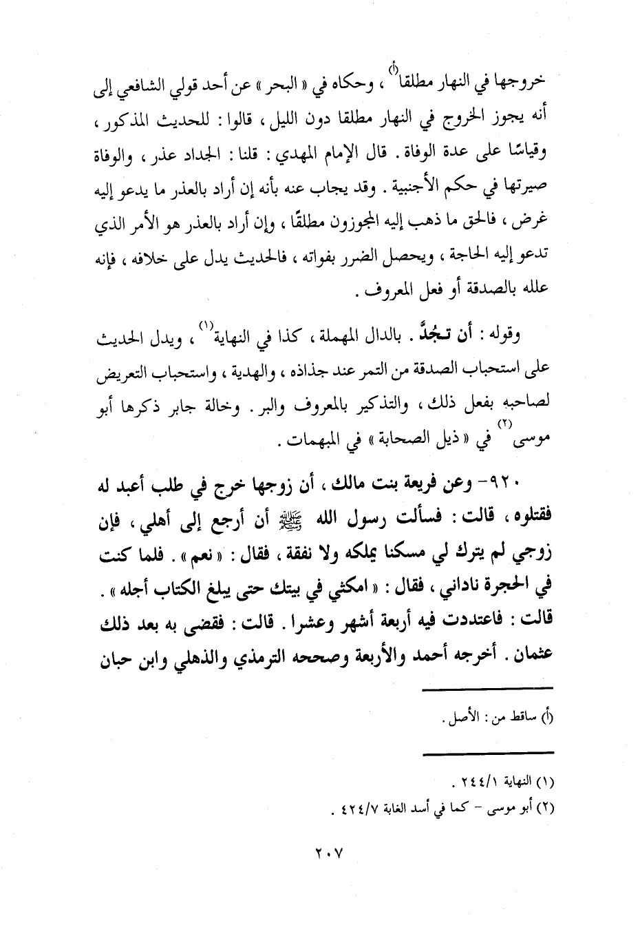 920 - وعن فريعة بنت مالك، أن زوجها خرج في طلب أعبد له فقتلوه، قالت: فسألت رسول الله - صلى الله عليه وسلم - أن أرجع إلى أهلي، فإن زوجي لم يترك لي مسكنا يملكه ولا نفقة، فقال: "نعم". فلما كنت في الحجرة ناداني، فقال: "امكثي في بيتك حتى يبلغ الكتاب أجله". قالت: فاعتددت فيه أربعة أشهر وعشرا. قالت: فقضى به بعد ذلك عثمان. أخرجه أحمد والأربعة وصححه الترمذي والذهلي وابن حبان