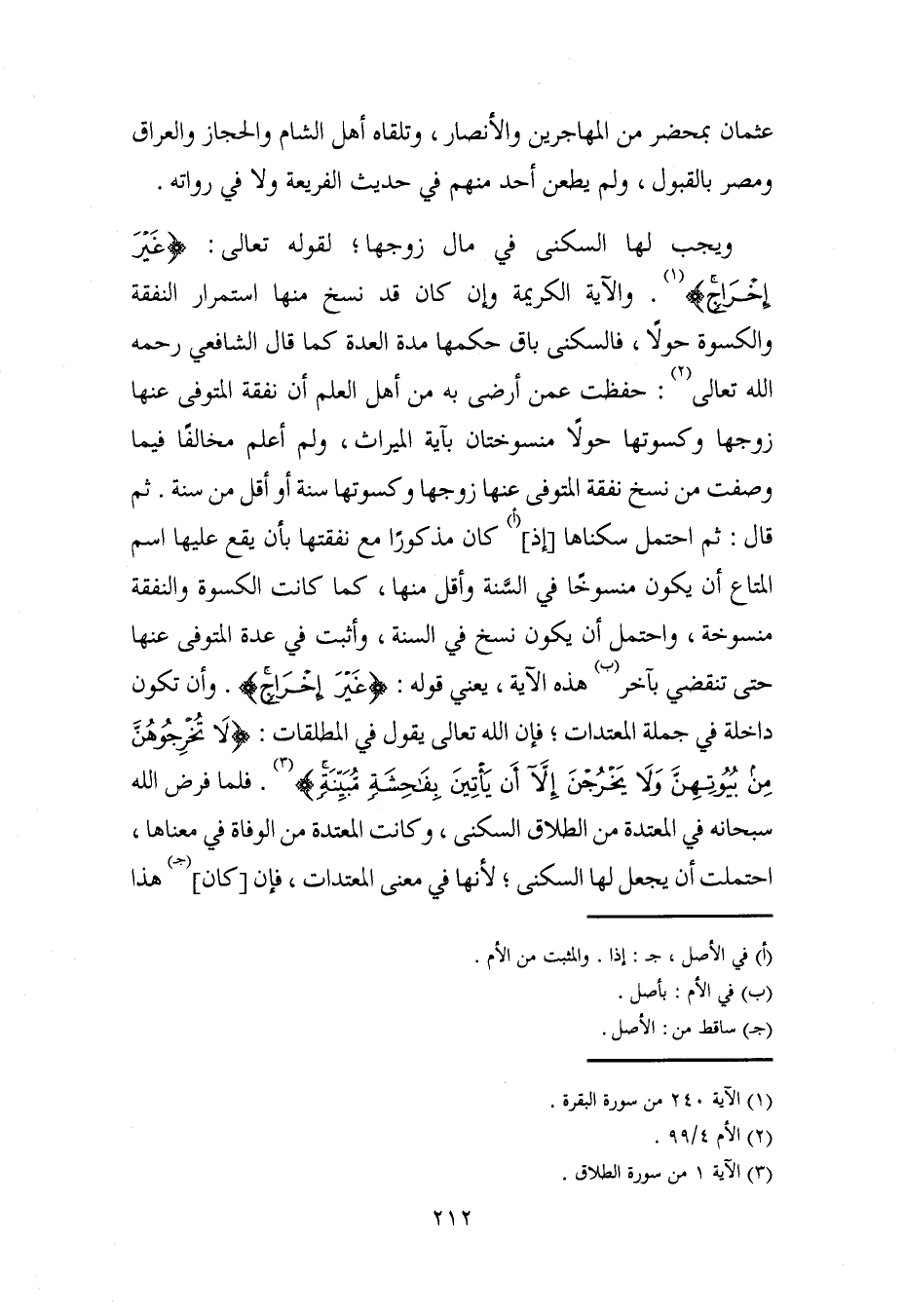 ويجب لها السكنى في مال زوجها؛ لقوله تعالى: {غَيْرَ إخْرَاجٍ} (¬1). والآية الكريمة وإن كان قد نسخ منها استمرار النفقة والكسوة حولًا، فالسكنى باق حكمها مدة العدة كما قال الشافعي رحمه الله تعالى (¬2): حفظت عمن أرضى به من أهل العلم أن نفقة المتوفى عنها زوجها وكسوتها حولًا منسوختان بآية الميراث، ولم أعلم مخالفًا فيما وصفت من نسخ نفقة المتوفى عنها زوجها وكسوتها سنة أو أقل من سنة. ثم قال: ثم احتمل سكناها [إذ] (أ) كان مذكورًا مع نفقتها بأن يقع عليها اسم المتاع أن يكون منسوخًا في السَّنة وأقل منها، كما كانت الكسوة والنفقة منسوخة، واحتمل أن يكون نسخ في السنة، وأثبت في عدة المتوفى عنها حتى تنقضي بآخر (ب) هذه الآية، يعني قوله: {غَيْرَ إِخْرَاجٍ}. وأن تكون داخلة في جملة المعتدات؛ فإن الله تعالى يقول في المطلقات: {لَا تُخْرِجُوهُنَّ مِنْ بُيُوتِهِنَّ وَلَا يَخْرُجْنَ إلا أَنْ يَأْتِينَ بِفَاحِشَةٍ مُبَيِّنَةٍ} (¬3). فلما فرض الله سبحانه في المعتدة من الطلاق السكنى، وكانت المعتدة من الوفاة في معناها، احتملت أن يجعل لها السكنى؛ لأنها في معنى المعتدات، فإن [كان] (جـ) هذا