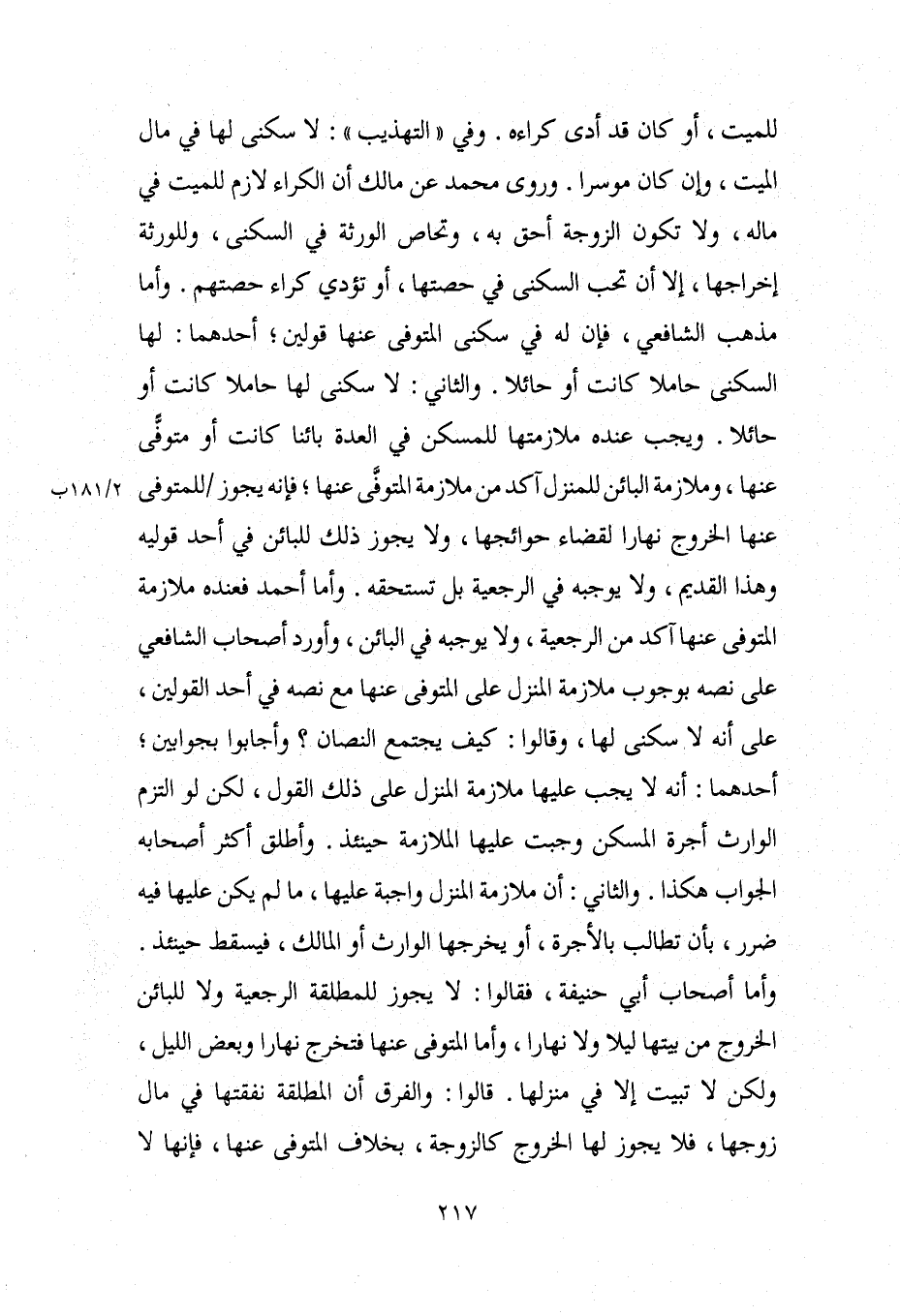 للميت، أو كان قد أدى كراءه. وفي "التهذيب": لا سكنى لها في مال الميت، وإن كان موسرا. وروى محمد عن مالك أن الكراء لازم للميت في ماله، ولا تكون الزوجة أحق به، وتحاص الورثة في السكنى، وللورثة إخراجها، إلا أن تحب السكنى في حصتها، أو تؤدي كراء حصتهم. وأما مذهب الشافعي، فإن له في سكنى المتوفى عنها قولين؛ أحدهما: لها السكنى حاملا كانت أو حائلا. والثاني: لا سكنى لها حاملا كانت أو حائلا. ويجب عنده ملازمتها للمسكن في العدة بائنا كانت أو متوفًّى عنها، وملازمة البائن للمنزل آكد من ملازمة المتوفَّى عنها؛ فإنه يجوز للمتوفى عنها الخروج نهارا لقضاء حوائجها، ولا يجوز ذلك للبائن في أحد قوليه وهذا القديم، ولا يوجبه في الرجعية بل تستحقه. وأما أحمد فعنده ملازمة المتوفى عنها آكد من الرجعية، ولا يوجبه في البائن، وأورد أصحاب الشافعي على نصه بوجوب ملازمة المنزل على المتوفى عنها مع نصه في أحد القولين، على أنه لا سكنى لها، وقالوا: كيف يجتمع النصان؟ وأجابوا بجوابين؛ أحدهما: أنه لا يجب عليها ملازمة المنزل على ذلك القول، لكن لو التزم الوارث أجرة المسكن وجبت عليها اللازمة حينئذ. وأطلق أكثر أصحابه الجواب هكذا. والثاني: أن ملازمة المنزل واجبة عليها، ما لم يكن عليها فيه ضرر، بأن تطالب بالأجرة، أو يخرجها الوارث أو المالك، فيسقط حينئذ. وأما أصحاب أبي حنيفة، فقالوا: لا يجوز للمطلقة الرجعية ولا للبائن الخروج من بيتها ليلا ولا نهارا، وأما المتوفى عنها فتخرج نهارا وبعض الليل، ولكن لا تبيت إلا في منزلها. قالوا: والفرق أن المطلقة نفقتها في مال زوجها، فلا يجوز لها الخروج كالزوجة، بخلاف المتوفى عنها، فإنها لا