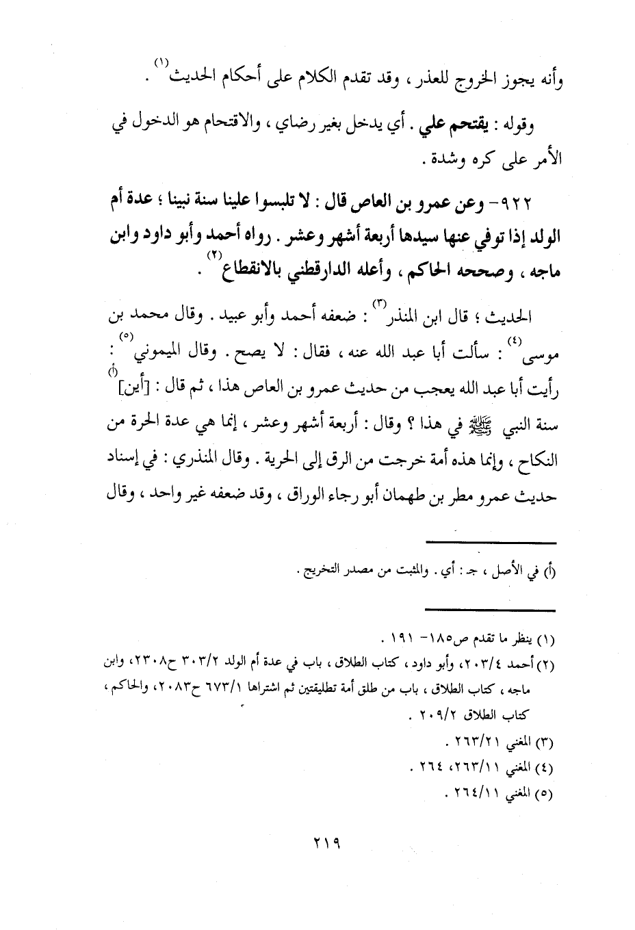 922 - وعن عمرو بن العاص قال: لا تلبسوا علينا سنة نبينا؛ عدة أم الولد إذا توفي عنها سيدها أربعة أشهر وعشر. رواه أحمد وأبو داود وابن ماجه، وصححه الحاكم، وأعله الدارقطني بالانقطاع (¬2).