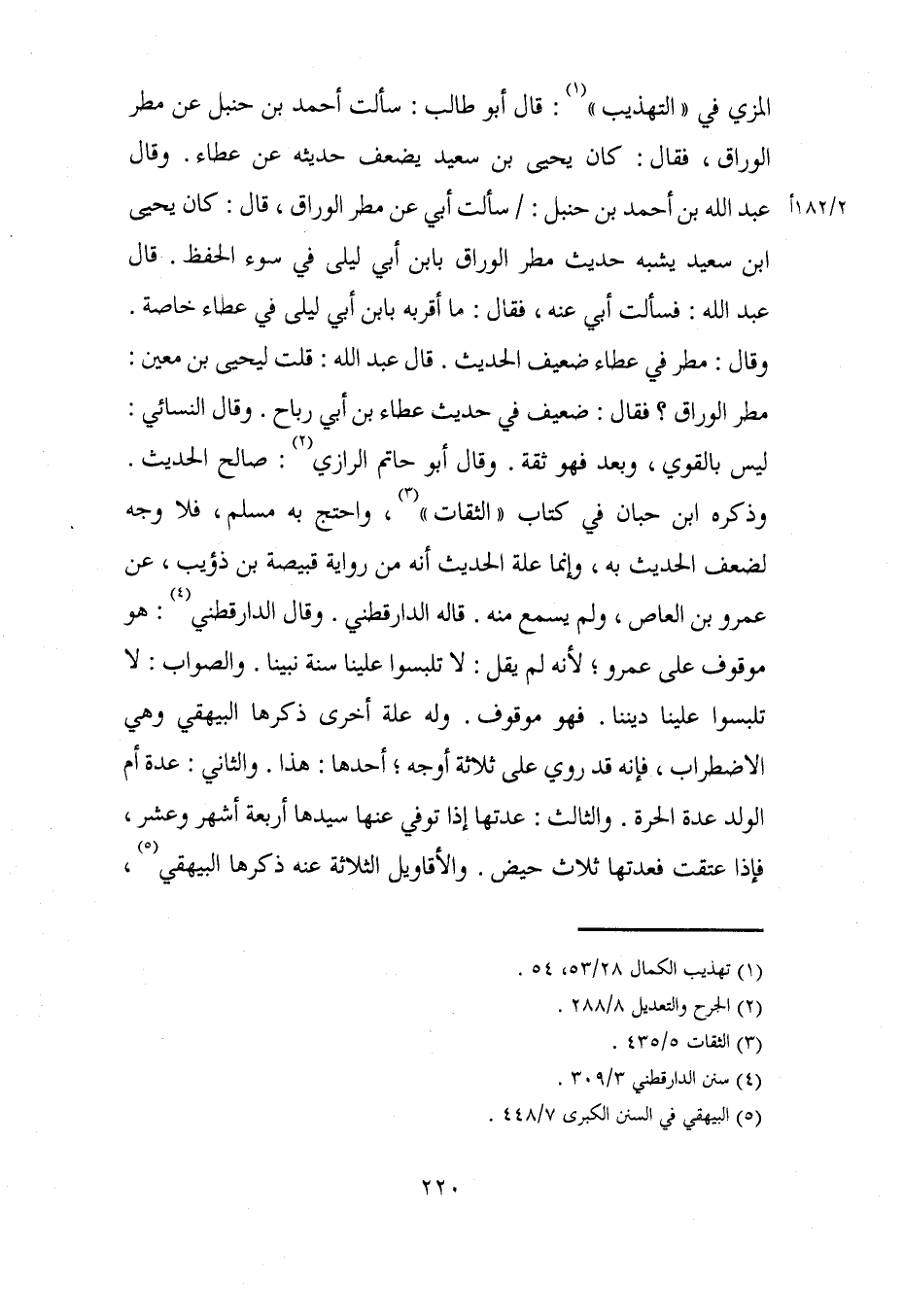 المزي في "التهذيب" (¬1): قال أبو طالب: سألت أحمد بن حنبل عن مطر الوراق، فقال: كان يحيى بن سعيد يضعف حديثه عن عطاء. وفال عبد الله بن أحمد بن حنبل: سألت أبي عن مطر الوراق، قال: كان يحيى بن سعيد يشبه حديث مطر الوراق بابن أبي ليلي في سوء الحفظ. قال عبد الله: فسألت أبي عنه، فقال: ما أقربه بابن أبي ليلى في عطاء خاصة. وقال: مطر في عطاء ضعيف الحديث. قال عبد الله: قلت ليحيى بن معين: مطر الوراق؟ فقال: ضعيف في حديث عطاء بن أبي رباح. وقال النسائي: ليس بالقوي، وبعد فهو ثقة. وقال أبو حاتم الرازي (¬2): صالح الحديث. وذكره ابن حبان في كتاب "الثقات" (¬3)، واحتج به مسلم، فلا وجه لضعف الحديث به، وإنما علة الحديث أنه من رواية قبيصة بن ذؤيب، عن عمرو بن العاص، ولم يسمع منه. قاله الدارقطني. وقال الدارقطني (¬4): هو موقوف على عمرو؛ لأنه لم يقل: لا تلبسوا علينا سنة نبينا. والصواب: لا تلبسوا علينا ديننا. فهو موقوف. وله علة أخرى ذكرها البيهقي وهي الاضطراب، فإنه قد روي على ثلاثة أوجه؛ أحدها: هذا. والثاني: عدة أم الولد عدة الحرة. والثالث: عدتها إذا توفي عنها سيدها أربعة أشهر وعشر، فإذا عتقت فعدتها ثلاث حيض. والأقاويل الثلاثة عنه ذكرها البيهقي (¬5)،