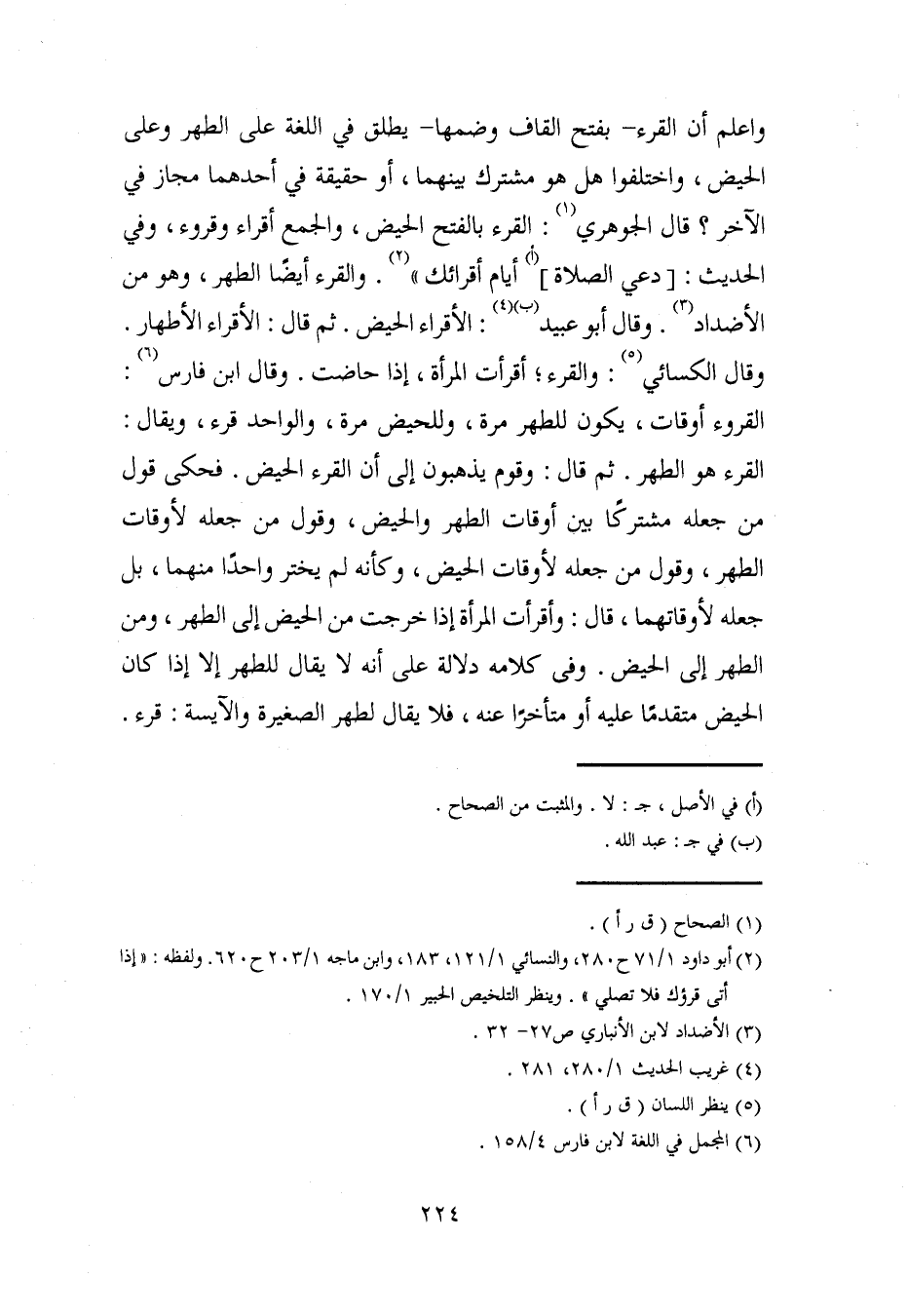 واعلم أن القرء -بفتح القاف وضمها- يطلق في اللغة على الطهر وعلى الحيض، واختلفوا هل هو مشترك بينهما، أو حقيقة في أحدهما مجاز في الآخر؟ قال الجوهري (¬1): القرء بالفتح الحيض، والجمع أقراء وقروء، وفي الحديث: [دعي الصلاة] (أ) أيام أقرائك" (¬2). والقرء أيضًا الطهر، وهو من الأضداد (¬3). وقال أبو عبيد (ب) (¬4): الأقراء الحيض. ثم قال: الأقراء الأطهار. وقال الكسائي (¬5): والقرء؛ أقرأت المرأة، إذا حاضت. وقال ابن فارس (¬6): القروء أوقات، يكون للطهر مرة، وللحيض مرة، والواحد قرء، ويقال: القرء هو الطهر. ثم قال: وقوم يذهبون إلى أن القرء الحيض. فحكى قول من جعله مشتركًا بين أوقات الطهر والحيض، وقول من جعله لأوقات الطهر، وقول من جعله لأوقات الحيض، وكأنه لم يختر واحدًا منهما، بل جعله لأوقاتهما، قال: وأقرأت المرأة إذا خرجت من الحيض إلى الطهر، ومن الطهر إلى الحيض. وفي كلامه دلالة على أنه لا يقال للطهر إلا إذا كان الحيض متقدمًا عليه أو متأخرًا عنه، فلا يقال لطهر الصغيرة والآيسة: قرء.