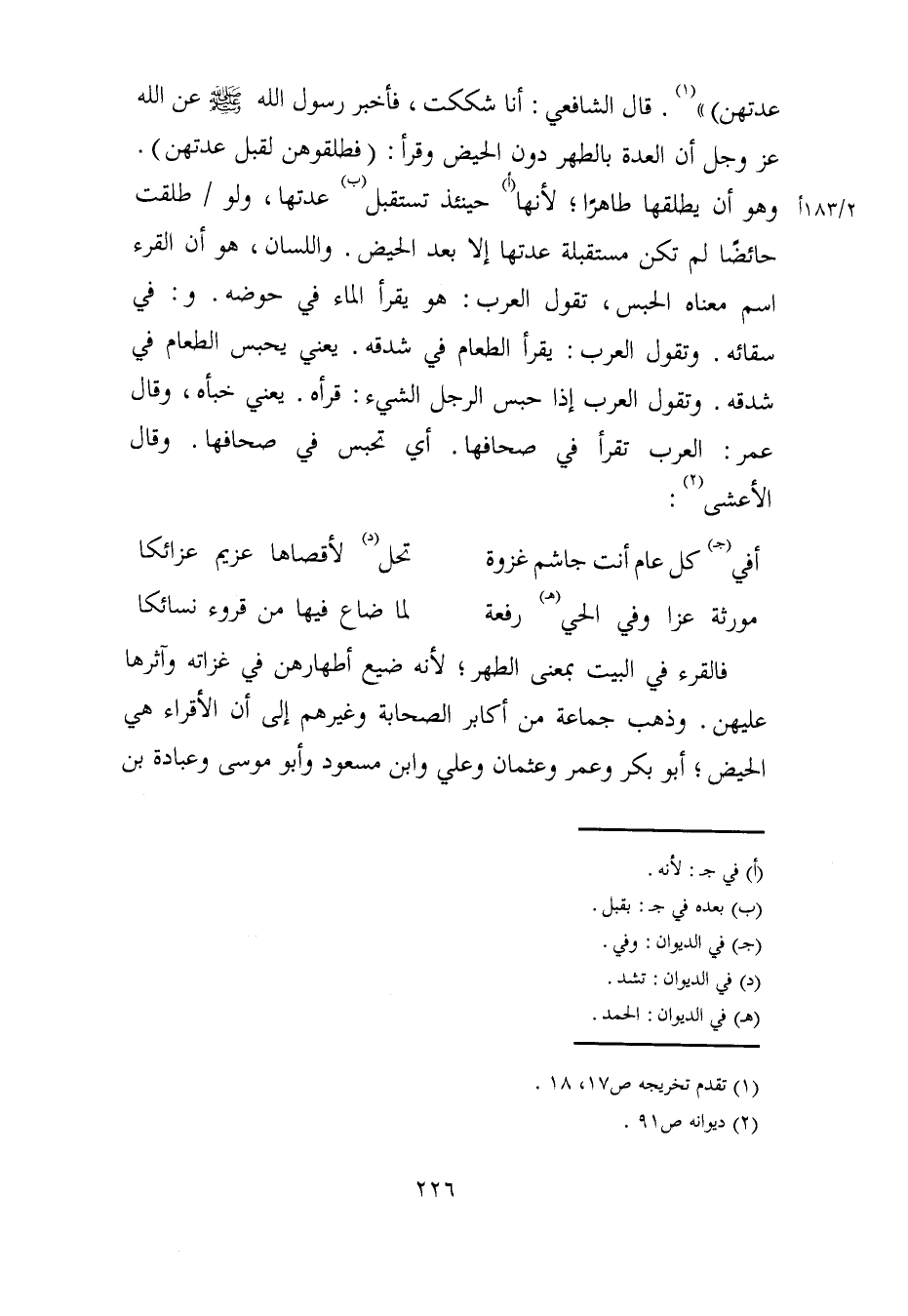 عدتهن) " (¬1). قال الشافعي: أنا شككت، فأخبر رسول الله - صلى الله عليه وسلم - عن الله عزَّ وجلَّ أن العدة بالطهر دون الحيض وقرأ: (فطلقوهن لقبل عدتهن). وهو أن يطلقها طاهرًا، لأنها (أ) حينئذ تستقبل (ب) عدتها، ولو طلقت حائضًا لم تكن مستقبلة عدتها إلا بعد الحيض. واللسان، هو أن القرء اسم معناه الحبس، تقول العرب: هو يقرأ الماء في حوضه. و: في سقائه. وتقول العرب: يقرأ الطعام في شدقه. يعني يحبس الطعام في شدقه. وتقول العرب إذا حبس الرجل الشيء: قرأه. يعني خبأه، وقال عمر: العرب تقرأ في صحافها. أي تحبس في صحافها. وقال الأعشى (¬2):