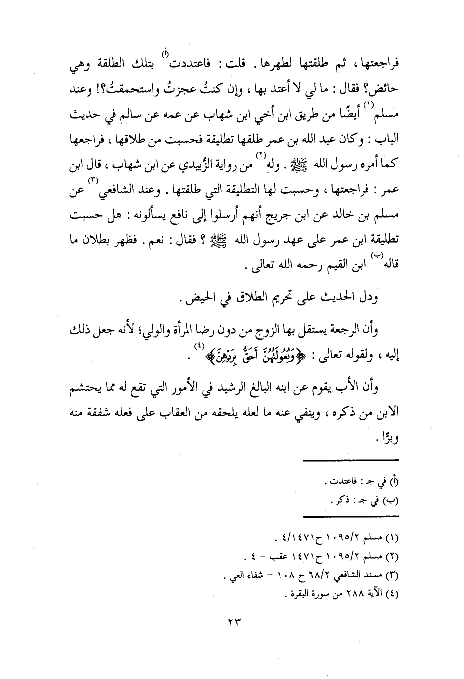 فراجعتها، ثم طلقتها لطهرها. قلت: فاعتددت (أ) بتلك الطلقة وهي حائض؟ فقال: ما لي لا أعتد بها، وإن كنتُ عجزتُ واستحمقت؟! وعند مسلم (¬1) أيضًا من طريق ابن أخي ابن شهاب عن عمه عن سالم في حديث الباب: وكان عبد الله بن عمر طلقها تطليقة فحسبت من طلاقها، فراجعها كما أمره رسول الله - صلى الله عليه وسلم - وله (¬2) من رواية الزُّبيدي عن ابن شهاب، قال ابن عمر: فراجعتها، وحسبت لها التطليقة التي طلقتها. وعند الشافعي (¬3) عن مسلم بن خالد عن ابن جريج أنهم أرسلوا إلى نافع يسألونه: هل حسبت تطليقة ابن عمر على عهد رسول الله - صلى الله عليه وسلم -؟ فقال: نعم. فظهر بطلان ما قاله (ب) ابن القيم رحمه الله تعالى.