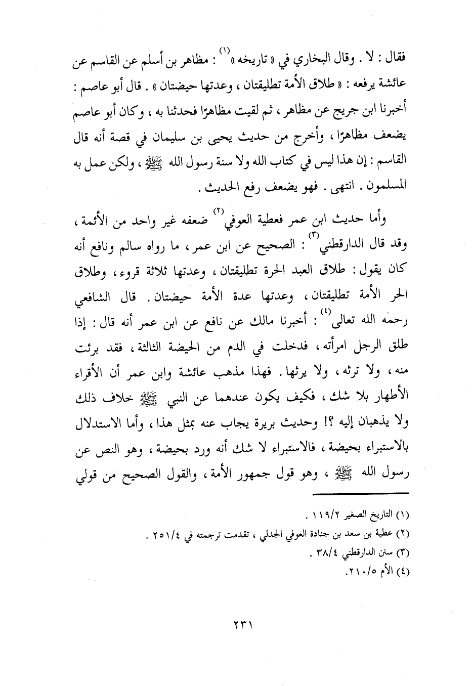 وأما حديث ابن عمر فعطية العوفي (¬2) ضعفه غير واحد من الأئمة، وقد قال الدارقطني (¬3): الصحيح عن ابن عمر، ما رواه سالم ونافع أنه كان يقول: طلاق العبد الحرة تطليقتان، وعدتها ثلاثة قروء، وطلاق الحر الأمة تطليقتان، وعدتها عدة الأمة حيضتان. قال الشافعي رحمه الله تعالى (¬4): أخبرنا مالك عن نافع عن ابن عمر أنه قال: إذا طلق الرجل امرأته، فدخلت في الدم من الحيضة الثالثة، فقد برئت منه، ولا ترثه، ولا يرثها. فهذا مذهب عائشة وابن عمر أن الأقراء الأطهار بلا شك، فكيف يكون عندهما عن النبي - صلى الله عليه وسلم - خلاف ذلك ولا يذهبان إليه؟! وحديث بريرة يجاب عنه بمثل هذا، وأما الاستدلال بالاستبراء بحيضة، فالاستبراء لا شك أنه ورد بحيضة، وهو النص عن رسول الله - صلى الله عليه وسلم -، وهو قول جمهور الأمة، والقول الصحيح من قولي