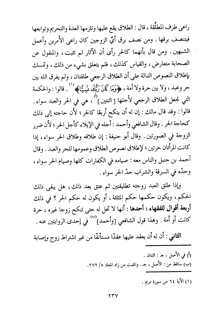 راعى طرف المطلَّقة، قال: الطلاق يقع عليها وتلزمها العدة والتحريم وتوابعها فيتنصف برقها. ومن نصف برق أيِّ الزوجين كان راعى الأمرين وأعمل الشبهين. ومن قال بأنهما كالحر رأى أن الآثار لم تثبت، والمنقول عن الصحابة متعارض، والقياس كذلك، فلم يتعلق بشيء من ذلك، وتمسك بإطلاق النصوص الدالة على أن الطلاق الرجعي طلقتان، ولم يفرق الله بين حر وعبد، ولا بين حرة ولا أمة، {وَمَا كَانَ رَبُّكَ نَسِيًّا} (¬1). قالوا: والحكمة التي جُعل الطلاق الرجعي لأجلها [اثنتين] (أ)، هي في الحر والعبد سواء. قالوا: وقد قال مالك: إن له أن ينكح أربعًا كالحر؛ لأن حاجته إلى ذلك كحاجة الحر. وقال الشافعي وأحمد: أجله في الإيلاء كأجل الحر؛ لأن ضرر الزوجة في الصورتين. وقال أبو حنيفة: إن طلاقه وطلاق الحر سواء، إذا كانت المرأتان حرتين؛ لإطلاق نصوص الطلاق وعمومها للحر والعبد. وقال أحمد بن حنبل والناس معه: صيامه في الكفارات كلها وصيام الحر سواء، وحدّه في السرقة والشراب حدّ الحر سواء.