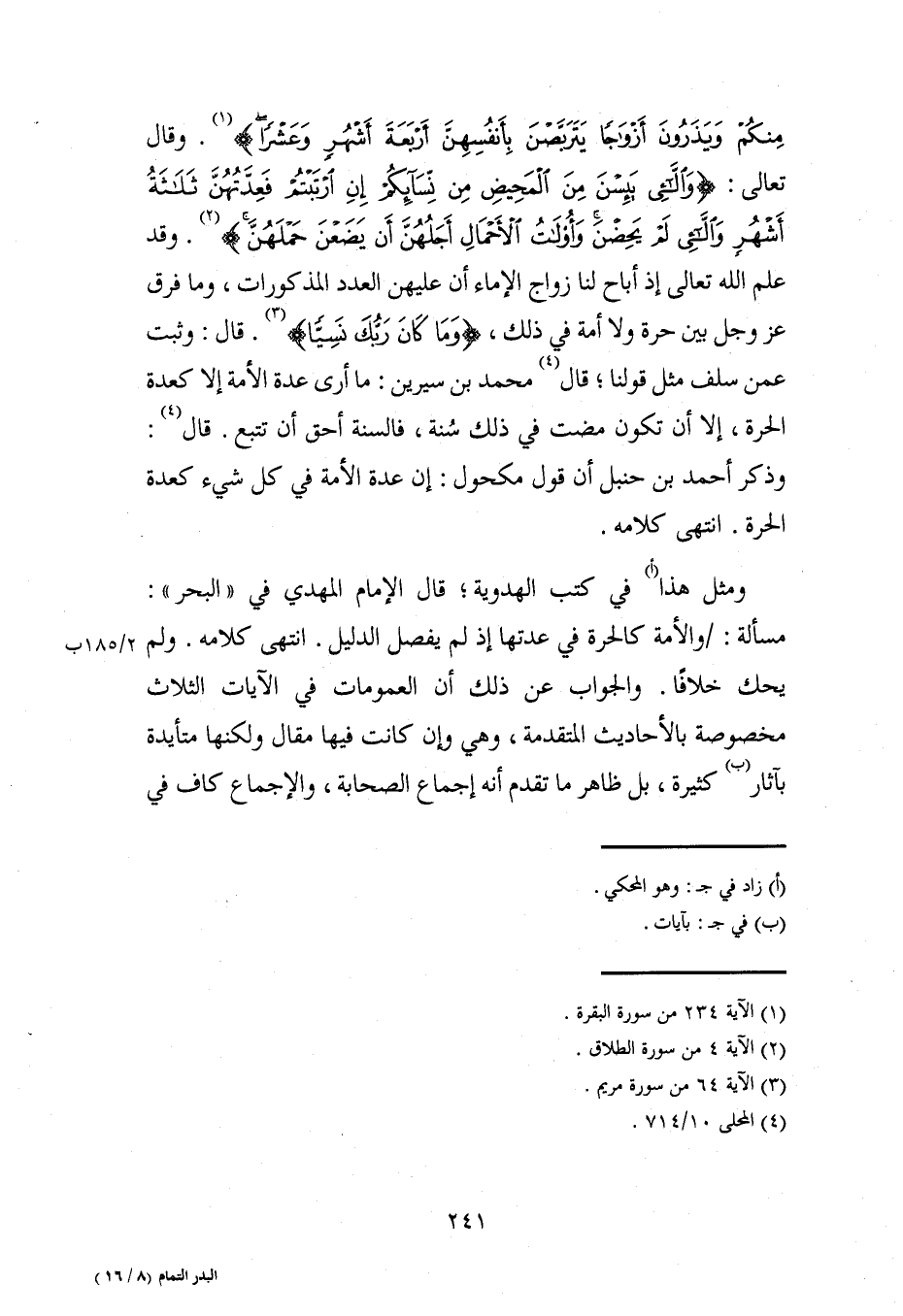 ومثل هذا (أ) في كتب الهدوية؛ قال الإمام المهدي في "البحر": مسألة: والأمة كالحرة في عدتها إذ لم يفصل الدليل. انتهى كلامه. ولم يحك خلافًا. والجواب عن ذلك أن العمومات في الآيات الثلاث مخصوصة بالأحاديث المتقدمة، وهي وإن كانت فيها مقال ولكنها متأيدة بآثار (ب) كثيرة، بل ظاهر ما تقدم أنه إجماع الصحابة، والإجماع كاف في