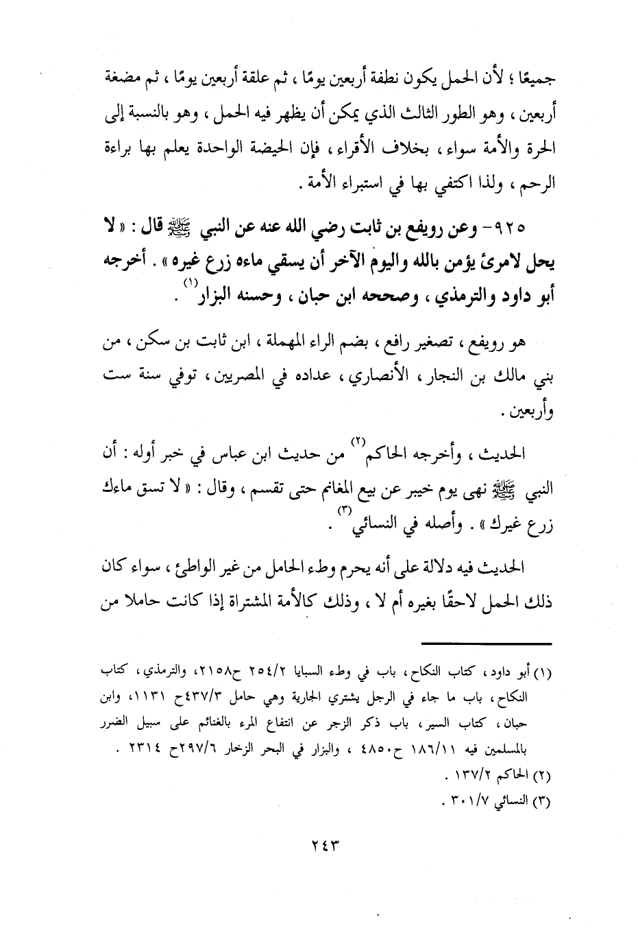 (¬1) أبو داود، كتاب النكاح، باب في وطء السبايا 2/ 254 ح 2158، والترمذي، كتاب النكاح، باب ما جاء في الرجل يشتري الجارية وهي حامل 3/ 437 ح 1131، وابن حبان، كتاب السير، باب ذكر الزجر عن انتفاع المرء بالغنائم على سبيل الضرر بالمسلمين فيه 11/ 186 ح 4850، والبزار في البحر الزخار 6/ 297 ح 2314.