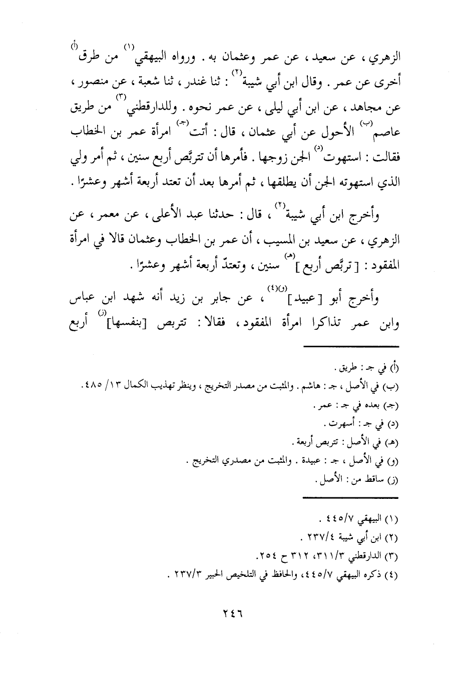 وأخرج ابن أبي شيبة (2)، قال: حدثنا عبد الأعلى، عن معمر، عن الزهري، عن سعيد بن المسيب، أن عمر بن الخطاب وعثمان قالا في امرأة المفقود: [تربَّص أربع] (هـ) سنين، وتعتدّ أربعة أشهر وعشرًا.