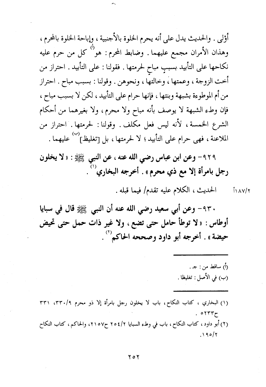 930 - وعن أبي سعيد رضي الله عنه أن النبي - صلى الله عليه وسلم - قال في سبايا أوطاس: "لا توطأ حامل حتى تضع، ولا غير ذات حمل حتى تحيض حيضة". أخرجه أبو داود وصححه الحاكم (¬2).