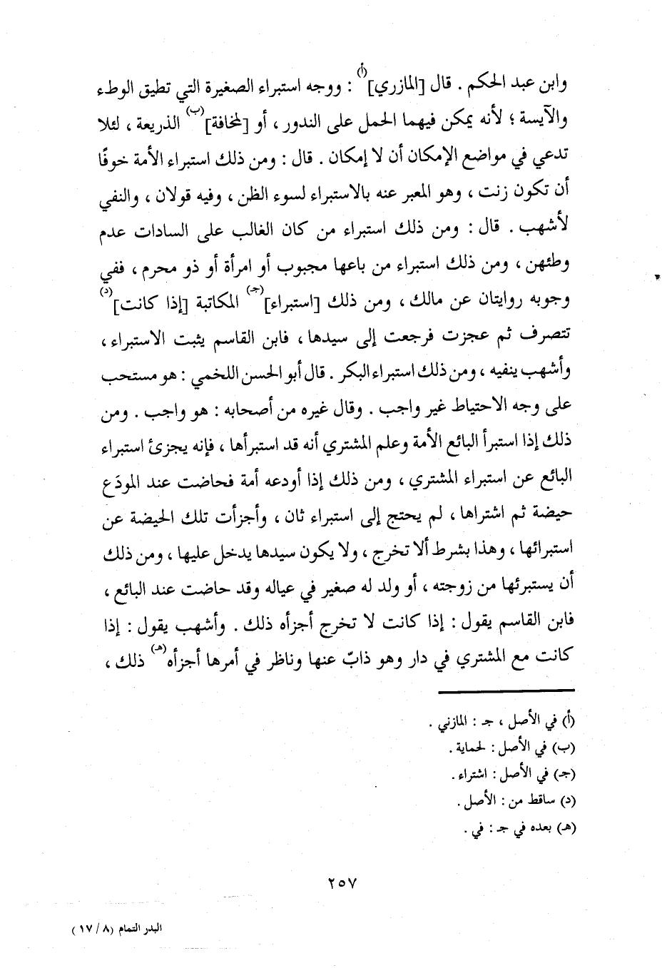 وابن عبد الحكم. قال [المازري] (أ): ووجه استبراء الصغيرة التي تطيق الوطء والآيسة، لأنه يمكن فيهما الحمل على الندور، أو [لمخافة] (ب) الذريعة، لئلا تدعي في مواضع الإمكان أن لا إمكان. قال: ومن ذلك استبراء الأمة خوفًا أن تكون زنت، وهو المعبر عنه بالاستبراء لسوء الظن، وفيه قولان، والنفي لأشهب. قال: ومن ذلك استبراء من كان الغالب على السادات عدم وطئهن، ومن ذلك استبراء من باعها مجبوب أو امرأة أو ذو محرم، ففي وجوبه روايتان عن مالك، ومن ذلك [استبراء] (جـ) المكاتبة [إذا كانت] (د) تتصرف ثم عجزت فرجعت إلى سيدها، فابن القاسم يثبت الاستبراء، وأشهب ينفيه، ومن ذلك استبراء البكر. قال أبو الحسن اللخمي: هو مستحب على وجه الاحتياط غير واجب. وقال غيره من أصحابه: هو واجب. ومن ذلك إذا استبرأ البائع الأمة وعلم المشتري أنه قد استبرأها، فإنه يجزئ استبراء البائع عن استبراء المشتري، ومن ذلك إذا أودعه أمة فحاضت عند المودَع حيضة ثم اشتراها، لم يحتج إلى استبراء ثان، وأجزأت تلك الحيضة عن استبرائها، وهذا بشرط ألا تخرج، ولا يكون سيدها يدخل عليها، ومن ذلك أن يستبرئها من زوجته، أو ولد له صغير في عياله وقد حاضت عند البائع، فابن القاسم يقول: إذا كانت لا تخرج أجزأه ذلك. وأشهب يقول: إذا كانت مع المشتري في دار وهو ذابّ عنها وناظر في أمرها أجزأه (هـ) ذلك،