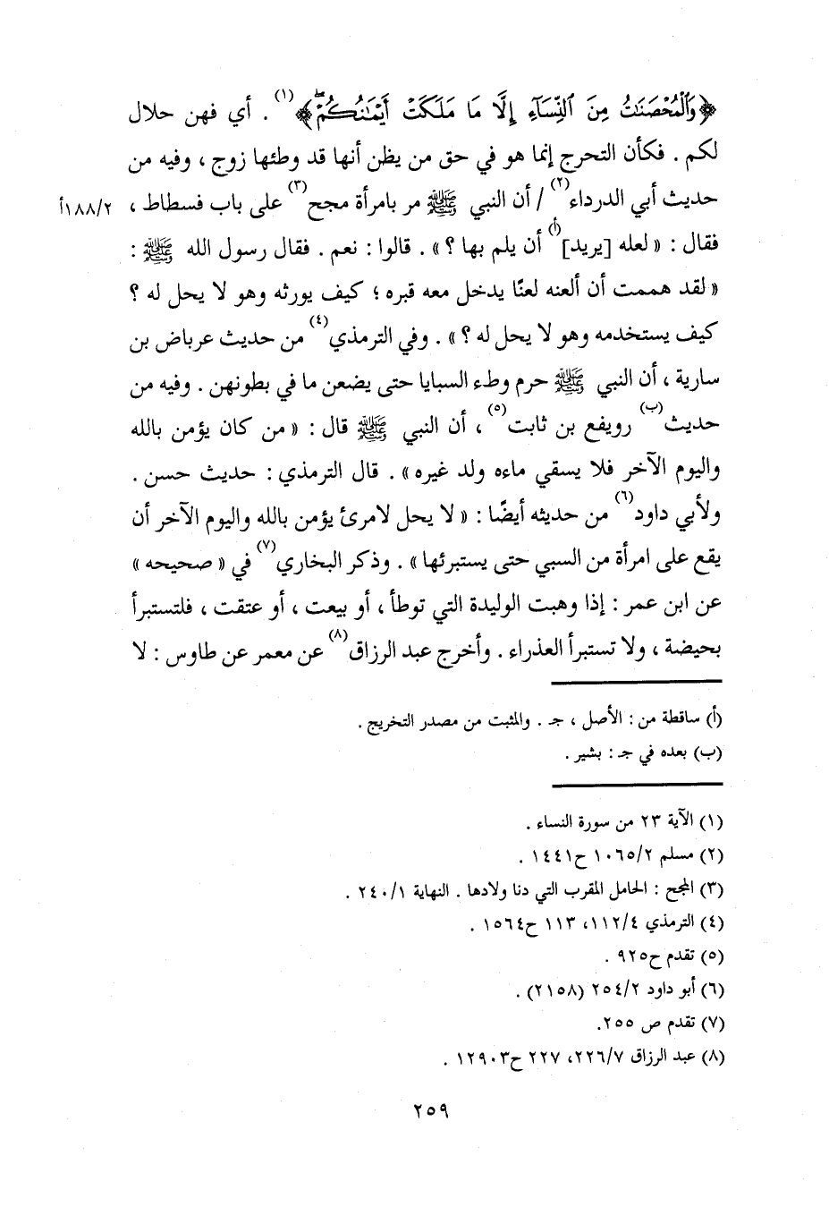 {وَالْمُحْصَنَاتُ مِنَ النِّسَاءِ إلا مَا مَلَكَتْ أَيْمَانُكُمْ} (¬1). أي فهن حلال لكم. فكأن التحرج إنما هو في حق من يظن أنها قد وطئها زوج، وفيه من حديث أبي الدرداء (¬2) أن النبي - صلى الله عليه وسلم - مر بامرأة مجح (¬3) على باب فسطاط، فقال: "لعله [يريد] (أ) أن يلم بها؟ ". قالوا: نعم. فقال رسول الله - صلى الله عليه وسلم -: "لقد هممت أن ألعنه لعنًا يدخل معه قبره؛ كيف يورثه وهو لا يحل له؟ كيف يستخدمه وهو لا يحل له؟ ". وفي الترمذي (¬4) من حديث عرباض بن سارية، أن النبي - صلى الله عليه وسلم - حرم وطء السبايا حتى يضعن ما في بطونهن. وفيه من حديث (ب) رويفع بن ثابت (¬5)، أن النبي - صلى الله عليه وسلم - قال: "من كان يؤمن بالله واليوم الآخر فلا يسقي ماءه ولد غيره". قال الترمذي: حديث حسن. ولأبي داود (¬6) من حديثه أيضًا: "لا يحل لامرئ يؤمن بالله واليوم الآخر أن يقع على امرأة من السبي حتى يستبرئها". وذكر البخاري (¬7) في "صحيحه" عن ابن عمر: إذا وهبت الوليدة التي توطأ، أو بيعت، أو عتقت، فلتستبرأ بحيضة، ولا تستبرأ العذراء. وأخرج عبد الرزاق (¬8) عن معمر عن طاوس: لا