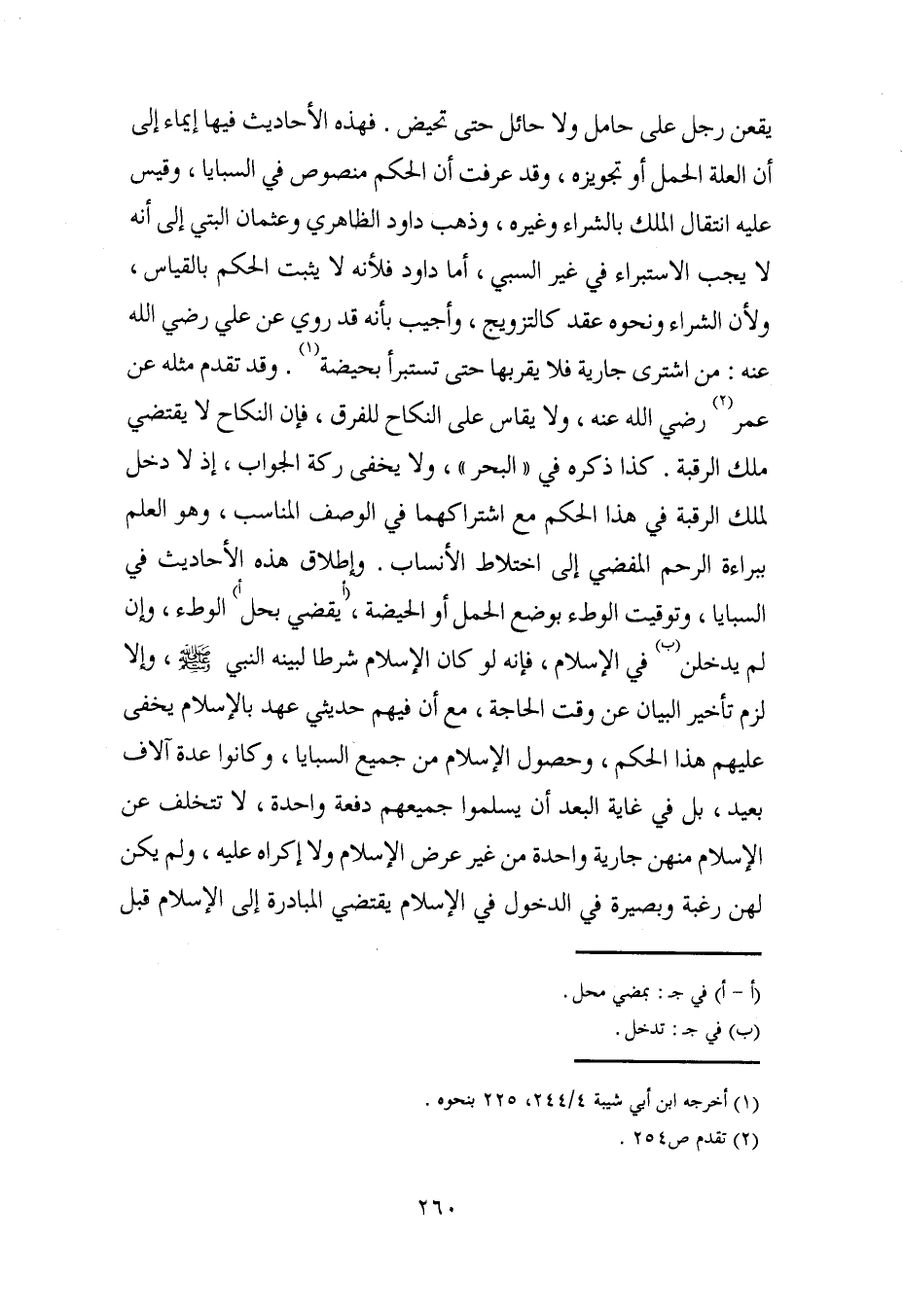 يقعن رجل على حامل ولا حائل حتى تحيض. فهذه الأحاديث فيها إيماء إلى أن العلة الحمل أو تجويزه، وقد عرفت أن الحكم منصوص في السبايا، وقيس عليه انتقال الملك بالشراء وغيره، وذهب داود الظاهري وعثمان البتي إلى أنه لا يجب الاستبراء في غير السبي، أما داود فلأنه لا يثبت الحكم بالقياس، ولأن الشراء ونحوه عقد كالتزويج، وأجيب بأنه قد روي عن علي رضي الله عنه: من اشترى جارية فلا يقربها حتى تستبرأ بحيضة (¬1). وقد تقدم مثله عن عمر (¬2) رضي الله عنه، ولا يقاس على النكاح للفرق، فإن النكاح لا يقتضي ملك الرقبة. كذا ذكره في "البحر"، ولا يخفى ركة الجواب، إذ لا دخل لملك الرقبة في هذا الحكم مع اشتراكهما في الوصف المناسب، وهو العلم ببراءة الرحم المفضي إلى اختلاط الأنساب. وإطلاق هذه الأحاديث في السبايا، وتوقيت الوطء بوضع الحمل أو الحيضة، (أيقضي بحل أ) الوطء، وإن لم يدخلن (ب) في الإسلام، فإنه لو كان الإسلام شرطا لبينه النبي - صلى الله عليه وسلم -، وإلا لزم تأخير البيان عن وقت الحاجة، مع أن فيهم حديثي عهد بالإسلام يخفى عليهم هذا الحكم، وحصول الإسلام من جميع السبايا، وكانوا عدة آلاف بعيد، بل في غاية البعد أن يسلموا جميعهم دفعة واحدة، لا تتخلف عن الإسلام منهن جارية واحدة من غير عرض الإسلام ولا إكراه عليه، ولم يكن لهن رغبة وبصيرة في الدخول في الإسلام يقتضي المبادرة إلى الإسلام قبل