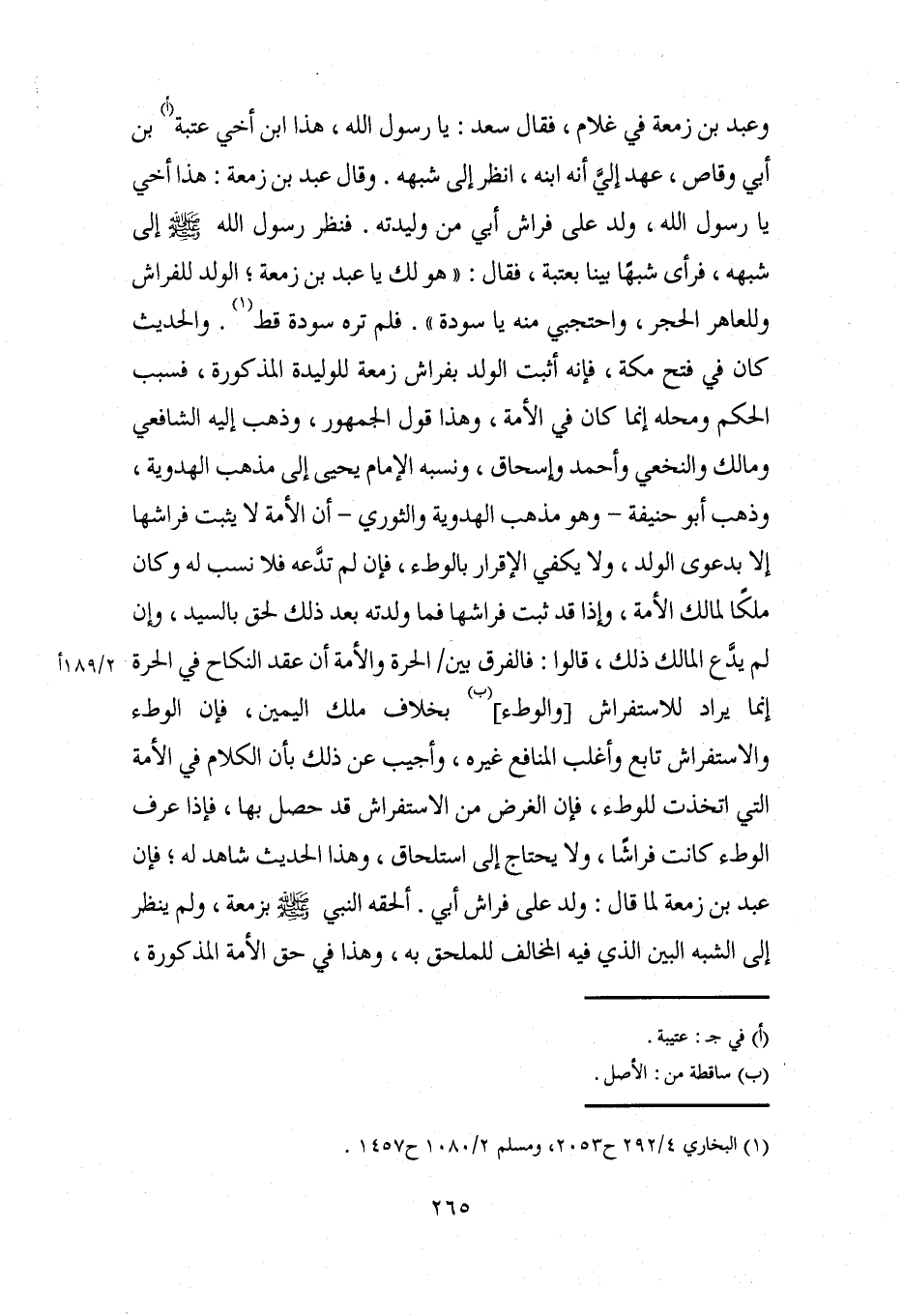 وعبد بن زمعة في غلام، فقال سعد: يا رسول الله، هذا ابن أخي عتبة (أ) بن أبي وقاص، عهد إليَّ أنه ابنه، انظر إلى شبهه. وقال عبد بن زمعة: هذا أخي يا رسول الله، ولد على فراش أبي من وليدته. فنظر رسول الله - صلى الله عليه وسلم - إلى شبهه، فرأى شبهًا بينا بعتبة، فقال: "هو لك يا عبد بن زمعة، الولد للفراش وللعاهر الحجر، واحتجبي منه يا سودة". فلم تره سودة قط (¬1). والحديث كان في فتح مكة، فإنه أثبت الولد بفراش زمعة للوليدة المذكورة، فسبب الحكم ومحله إنما كان في الأمة، وهذا قول الجمهور، وذهب إليه الشافعي ومالك والنخعي وأحمد وإسحاق، ونسبه الإمام يحيى إلى مذهب الهدوية، وذهب أبو حنيفة -وهو مذهب الهدوية والثوري- أن الأمة لا يثبت فراشها إلا بدعوى الولد، ولا يكفي الإقرار بالوطء، فإن لم تدَّعه فلا نسب له وكان ملكًا لمالك الأمة، وإذا قد ثبت فراشها فما ولدته بعد ذلك لحق بالسيد، وإن لم يدَّع المالك ذلك، قالوا: فالفرق بين الحرة والأمة أن عقد النكاح في الحرة إنما يراد للاستفراش [والوطء] (ب) بخلاف ملك اليمين، فإن الوطء والاستفراش تابع وأغلب المنافع غيره، وأجيب عن ذلك بأن الكلام في الأمة التي اتخذت للوطء، فإن الغرض من الاستفراش قد حصل بها، فإذا عرف الوطء كانت فراشًا، ولا يحتاج إلى استلحاق، وهذا الحديث شاهد له؛ فإن عبد بن زمعة لما قال: ولد على فراش أبي. ألحقه النبي - صلى الله عليه وسلم - بزمعة، ولم ينظر إلى الشبه البين الذي فيه المخالف للملحق به، وهذا في حق الأمة المذكورة،