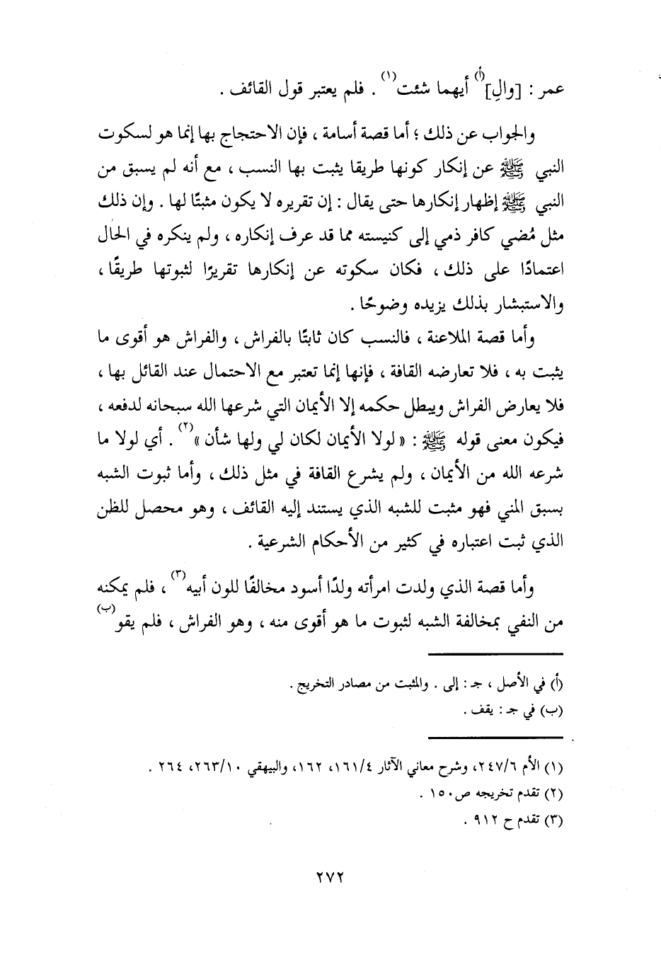 والجواب عن ذلك؛ أما قصة أسامة، فإن الاحتجاج بها إنما هو لسكوت النبي - صلى الله عليه وسلم - عن إنكار كونها طريقا يثبت بها النسب، مع أنه لم يسبق من النبي - صلى الله عليه وسلم - إظهار إنكارها حتى يقال: إن تقريره لا يكون مثبتًا لها. وإن ذلك مثل مُضي كافر ذمي إلى كنيسته مما قد عرف إنكاره، ولم ينكره في الحال اعتمادًا على ذلك، فكان سكوته عن إنكارها تقريرًا لثبوتها طريقًا، والاستبشار بذلك يزيده وضوحًا.