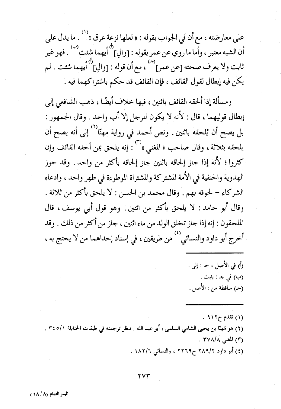 ومسألة إذا ألحقه القائف باثنين، فيها خلاف أيضًا، ذهب الشافعي إلى إبطال قوليهما، قال: لأنه لا يكون للرجل إلا أب واحد. وقال الجمهور: بل يصح أن يُلحقه باثنين. ونص أحمد في رواية مهنّا (¬2) إلى أنه يصح أن يلحقه بثلاثة، وقال صاحب "المغني" (¬3): إنه يلحق بمن ألحقه القائف وإن كثروا؛ لأنه إذا جاز إلحاقه باثنين جاز إلحاقه بأكثر من واحد. وقد جوز الهدوية والحنفية في الأمة المشتركة والمشتراة الموطوءة في طهر واحد، وادعاه الشركاء - لحوقه بهم. وقال محمد بن الحسن: لا يلحق بأكثر من ثلاثة. وقال أبو حامد: لا يلحق بأكثر من اثنين. وهو قول أبي يوسف، قال الملحقون: إنه إذا جاز تخلق الولد من ماء اثنين، جاز من أكثر من ذلك. وقد أخرج أبو داود والنسائي (¬4) من طريقين، في إسناد إحداهما من لا يحتج به،
