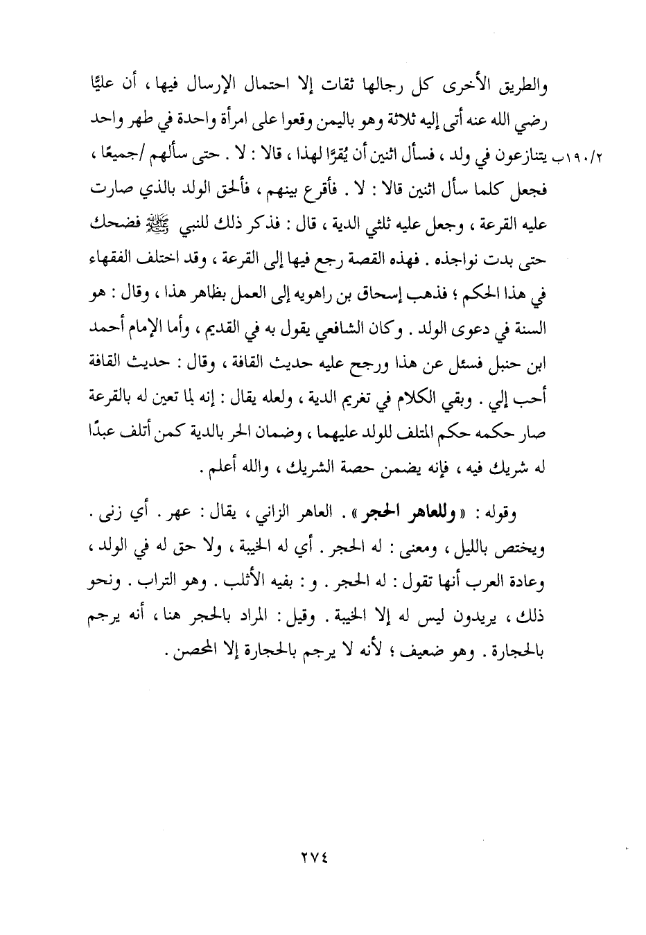 والطريق الأخرى كل رجالها ثقات إلا احتمال الإرسال فيها، أن عليًّا رضي الله عنه أتى إليه ثلاثة وهو باليمن وقعوا على امرأة واحدة في طهر واحد يتنازعون في ولد، فسأل اثنين أن يُقرَّا لهذا، قالا: لا. حتى سألهم جميعًا، فجعل كلما سأل اثنين قالا: لا. فأقرع بينهم، فألحق الولد بالذي صارت عليه القرعة، وجعل عليه ثلثي الدية، قال: فذكر ذلك للنبي - صلى الله عليه وسلم - فضحك حتى بدت نواجذه. فهذه القصة رجع فيها إلى القرعة، وقد اختلف الفقهاء في هذا الحكم؛ فذهب إسحاق بن راهويه إلى العمل بظاهر هذا، وقال: هو السنة في دعوى الولد. وكان الشافعي يقول به في القديم، وأما الإمام أحمد بن حنبل فسئل عن هذا ورجح عليه حديث القافة، وقال: حديث القافة أحب إلي. وبقي الكلام في تغريم الدية، ولعله يقال: إنه لما تعين له بالقرعة صار حكمه حكم المتلف للولد عليهما، وضمان الحر بالدية كمن أتلف عبدًا له شريك فيه، فإنه يضمن حصة الشريك، والله أعلم.