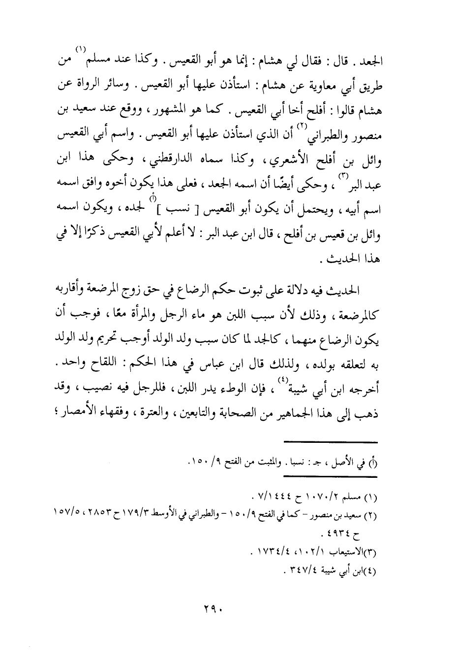 الجعد. قال: فقال لي هشام: إنما هو أبو القعيس. وكذا عند مسلم (¬1) من طريق أبي معاوية عن هشام: استأذن عليها أبو القعيس. وسائر الرواة عن هشام قالوا: أفلح أخا أبي القعيس. كما هو المشهور، ووقع عند سعيد بن منصور والطبراني (¬2) أن الَّذي استأذن عليها أبو القعيس. واسم أبي القعيس وائل بن أفلح الأشعري، وكذا سماه الدارقطني، وحكى هذا ابن عبد البر (¬3)، وحكى أيضًا أن اسمه الجعد، فعلى هذا يكون أخوه وافق اسمه اسم أبيه، ويحتمل أن يكون أبو القعيس [نسب] (أ) لجده، ويكون اسمه وائل بن قعيس بن أفلح، قال ابن عبد البر: لا أعلم لأبي القعيس ذكرًا إلا في هذا الحديث.