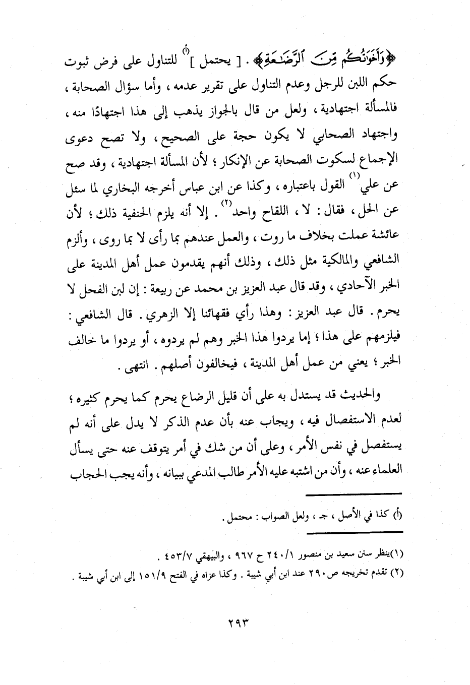 {وَأَخَوَاتُكُمْ مِنَ الرَّضَاعَةِ}. [يحتمل] (أ) للتناول على فرض ثبوت حكم اللبن للرجل وعدم التناول على تقرير عدمه، وأما سؤال الصحابة، فالمسألة اجتهادية، ولعل من قال بالجواز يذهب إلى هذا اجتهادًا منه، واجتهاد الصحابي لا يكون حجة على الصحيح، ولا تصح دعوى الإجماع لسكوت الصحابة عن الإنكار، لأن المسألة اجتهادية، وقد صح عن علي (¬1) القول باعتباره، وكذا عن ابن عباس أخرجه البخاري لما سئل عن الحل، فقال: لا، اللقاح واحد (¬2). إلا أنَّه يلزم الحنفية ذلك، لأن عائشة عملت بخلاف ما روت، والعمل عندهم بما رأى لا بما روى، وألزم الشافعي والمالكية مثل ذلك، وذلك أنهم يقدمون عمل أهل المدينة على الخبر الآحادي، وقد قال عبد العزيز بن محمد عن ربيعة: إن لبن الفحل لا يحرم. قال عبد العزيز: وهذا رأي فقهائنا إلا الزهري. قال الشافعي: فيلزمهم على هذا؛ إما يردوا هذا الخبر وهم لم يردوه، أو يردوا ما خالف الخبر، يعني من عمل أهل المدينة، فيخالفون أصلهم. انتهى.