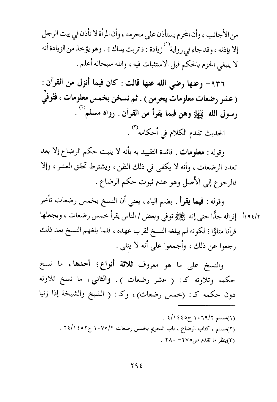 936 - وعنها رضي الله عنها قالت: كان فيما أنزل من القرآن: (عشر رضعات معلومات يحرمن). ثم نسخن بخمس معلومات، فتُوفِّي رسول الله - صلى الله عليه وسلم - وهن فيما يقرأ من القرآن. رواه مسلم (¬2).