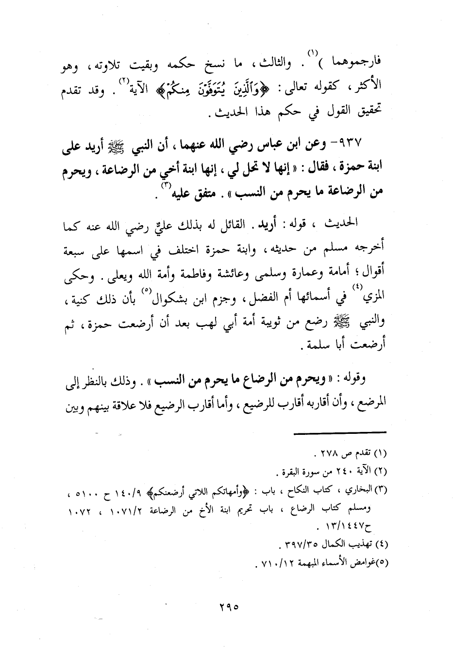 937 - وعن ابن عباس رضي الله عنهما، أن النبي - صلى الله عليه وسلم - أريد على ابنة حمزة، فقال: "إنها لا تحل لي، إنها ابنة أخي من الرضاعة، ويحرم من الرضاعة ما يحرم من النسب". متفق عليه (¬3).