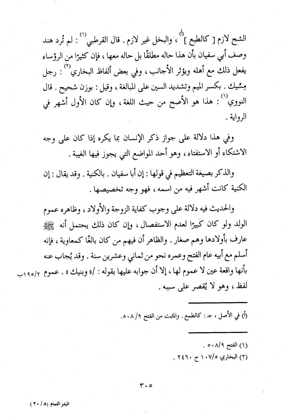 الشح لازم [كالطبع] (أ)، والبخل غير لازم. قال القرطبي (¬1): لم تُرد هند وصف أبي سفيان بأن هذا حاله مطلقًا بل حاله معها، فإن كثيرًا من الرؤساء يفعل ذلك مع أهله ويؤثر الأجانب، وفي بعض ألفاظ البخاري (¬2): رجل مِسِّيك. بكسر الميم وتشديد السين على المبالغة، وقيل: بوزن شحيح. قال النووي (1): هذا هو الأصح من حيث اللغة، وإن كان الأول أشهر في الرواية.